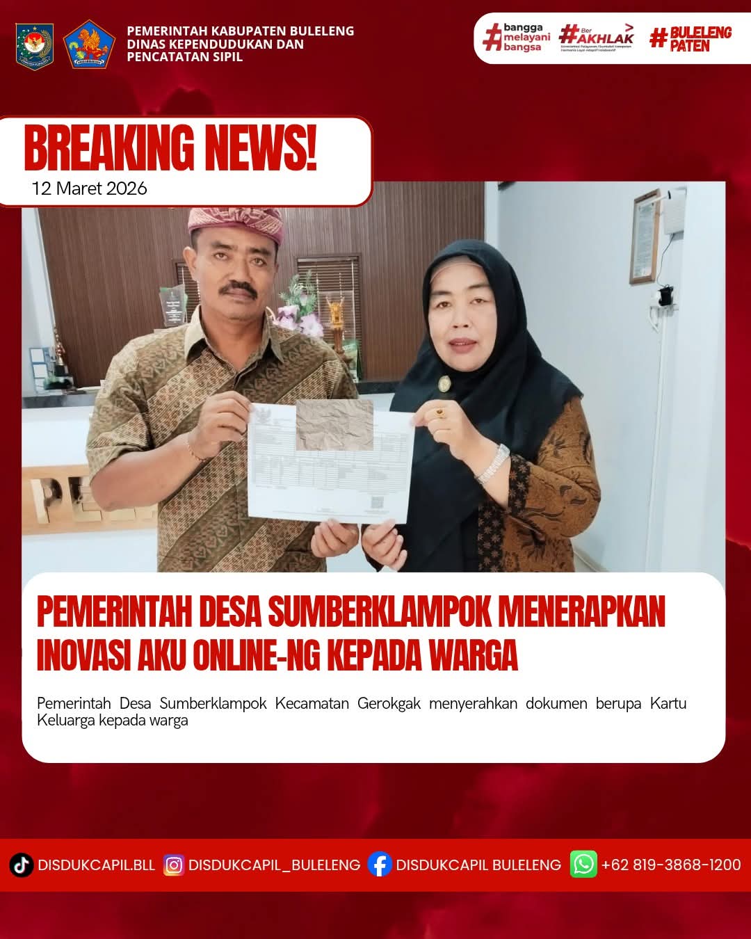 Pemerintah Kabupaten Buleleng melalui Dinas Kependudukan dan Pecatatan Sipil (Disdukcapil) Kabupaten Buleleng memaksimalkan serta mempermudah pelayanan kependudukan masyarakat dengan beberapa inovasi, melalui aplikasi AKU Online-NG. Dimana dalam penerapan aplikasi Aku Online-NG tersebut masyarakat tidak perlu lagi datang ke Dinas Dukcapil untuk melakukan pelayanan langsung cukup dengan datang ke Desa nanti akan dibantu oleh operator Desa masing-masing. Di Desa Sumberklampok Kecamatan Gerokgak, telah diserahkan dokumen kependudukan berupa Kartu Keluarga atas nama Sumardi yang diserahkan secara langsung oleh Kadus Sumberbatok bertempat di Kantor Perbekel Desa Sumberklampok, Kecamatan Gerokgak, Kamis (12/3).