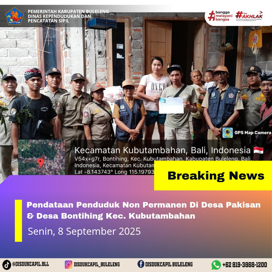 Kali ini Senin, 8 September 2025, Dinas Kependudukan dan Pencatatan Sipil Kabupaten Buleleng melaksanakan kegiatan pendataan penduduk Non Permanen di Desa Pakisan dan Desa Bontihing Kecamatan Kubutambahan. Dari pendataan penduduk kali ini didapatkan hasil :