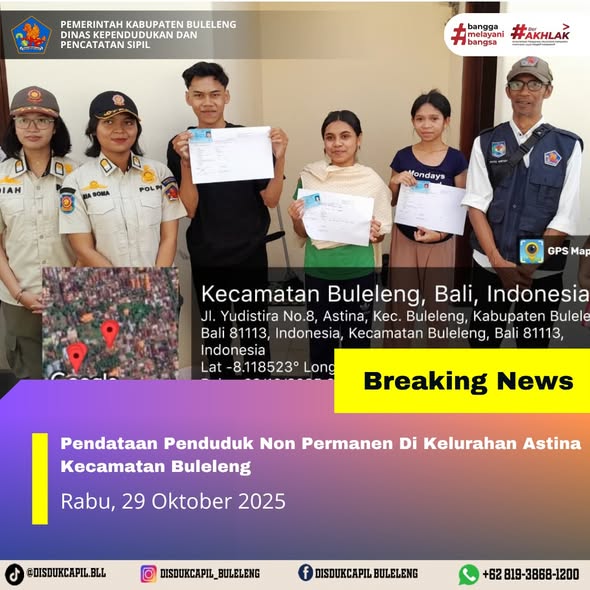 Kali ini Rabu, 29 Oktober 2025, Dinas Kependudukan dan Pencatatan Sipil Kabupaten Buleleng melaksanakan kegiatan pendataan penduduk Non Permanen di Kelurahan Astina Kecamatan Buleleng. Dari pendataan penduduk kali ini didapatkan hasil :