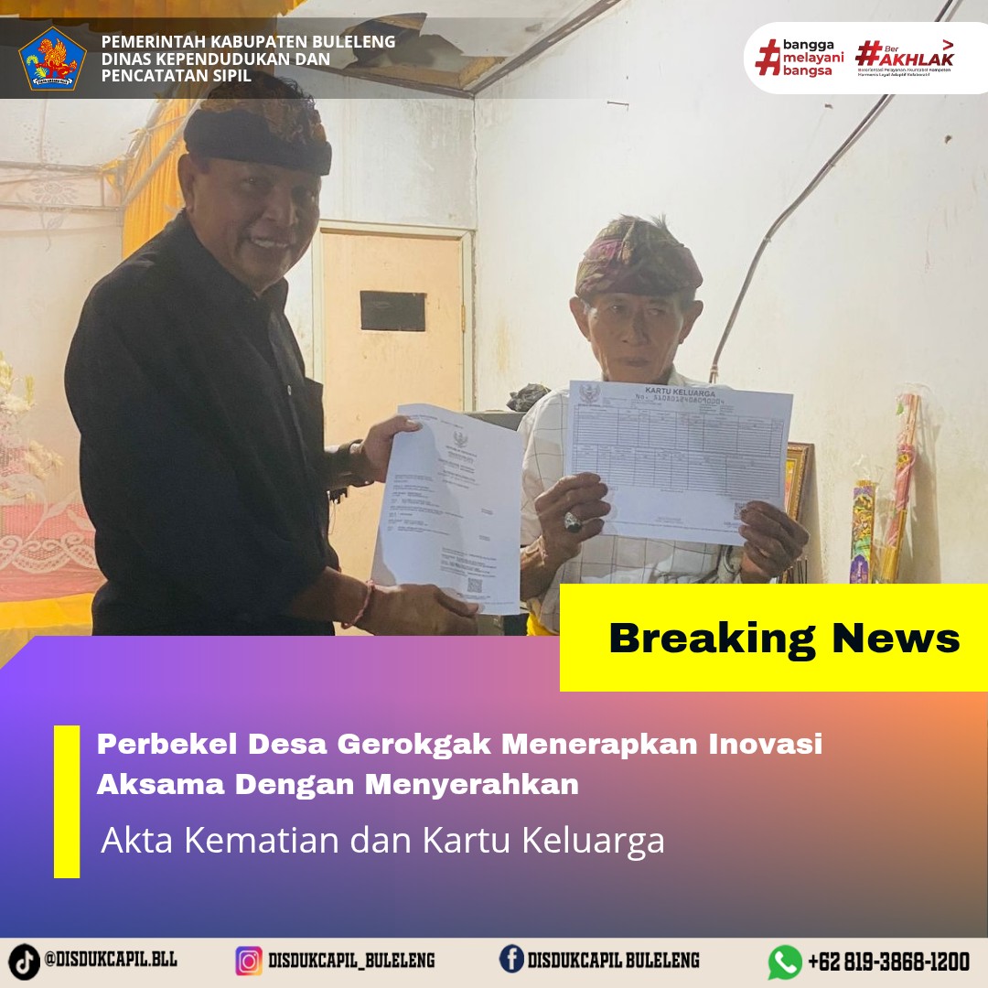 Pemerintah Kabupaten Buleleng melalui Dinas Kependudukan dan Pecatatan Sipil (Disdukcapil) Kabupaten Buleleng memaksimalkan serta mempermudah pelayanan kependudukan masyarakat dengan beberapa inovasi, yakni BALITA (Bayi Lahir Berakta), NYAKSI (Menyerahkan Akta Kawin Saat Acara Perkawinan) dan AKSAMA ( Akta Kematian Diserahkan Saat Masih Berduka) melalui aplikasi Aku Online-NG. Di Desa Gerokgak Kecamatan Gerokgak, telah diterapkan program Aksama (Akta Kematian Diserahkan Saat Masih Berduka) yang dilakukan secara langsung oleh Perbekel Desa Gerokgak I Nyoman Wijaya dengan menyerahkan Akta Kematian atas nama Gusti Made Siang dan Kartu Keluarga atas nama Gusti Putu Mayun kepada keluarga almarhum di Banjar Dinas Pucaksari, Desa Gerokgak, Jumat (21/11).