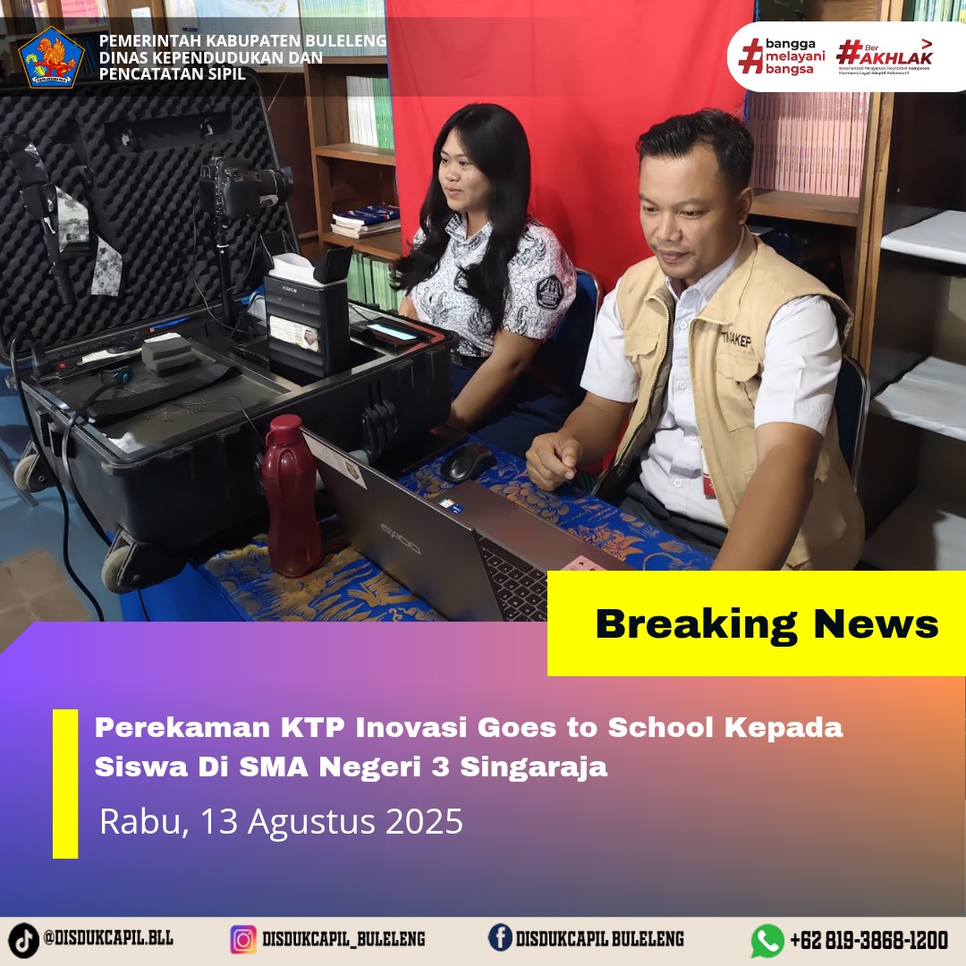 Pada kali ini Rabu, 13 Agustus 2025 pelayanan perekaman KTP-el dilaksanakan di SMA Negeri 3 Singaraja. Hasil perekaman di SMA Negeri 3 Singaraja dengan data BNBA sebanyak 11 siswa dan total yang melakukan perekaman sebanyak 117 orang, dimana hasil perekaman data di dalam BNBA sebanyak 1 siswa dan data di luar BNBA sebanyak 116 orang. Sisa data BNBA yang belum perekaman sebanyak 10 siswa, keterangan dari pihak sekolah sisa BNBA perekaman dilanjutkan besok.
