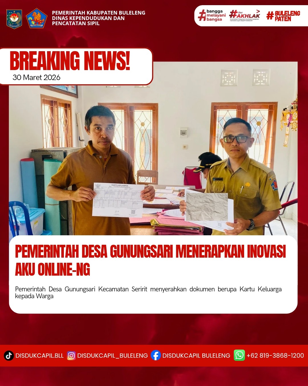 Pemerintah Kabupaten Buleleng melalui Dinas Kependudukan dan Pecatatan Sipil (Disdukcapil) Kabupaten Buleleng memaksimalkan serta mempermudah pelayanan kependudukan masyarakat dengan beberapa inovasi, melalui aplikasi AKU Online-NG. Dimana dalam penerapan aplikasi Aku Online-NG tersebut masyarakat tidak perlu lagi datang ke Dinas Dukcapil untuk melakukan pelayanan langsung, cukup dengan datang ke Desa nanti akan dibantu oleh operator Desa masing-masing. Di Desa Gunungsari Kecamatan Seririt, telah diserahkan dokumen kependudukan berupa Kartu Keluarga atas nama I Gede Restika warga Banjar Dinas Sekar, Desa Gunungsari yang diserahkan oleh Pemerintah Desa Gunungsari kepada warga Banjar Dinas Sekar, bertempat di Kantor Perbekel Desa Gunungsari, Kecamatan Seririt, Kabupaten Buleleng, Senin (30/3).