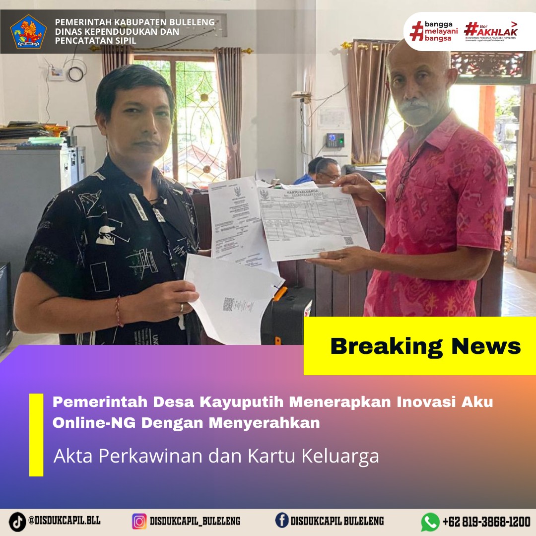 Pemerintah Kabupaten Buleleng melalui Dinas Kependudukan dan Pecatatan Sipil (Disdukcapil) Kabupaten Buleleng memaksimalkan serta mempermudah pelayanan kependudukan masyarakat dengan beberapa inovasi, melalui aplikasi AKU Online-NG. Dimana dalam penerapan aplikasi Aku Online-NG tersebut masyarakat tidak perlu lagi datang ke Dinas Dukcapil untuk melakukan pelayanan langsung cukup dengan datang ke Desa nanti akan dibantu oleh operator Desa masing-masing. Di Desa Kayuputih Kecamatan Banjar, telah diserahkan dokumen kependudukan berupa Akta Perkawinan dan Kartu Keluarga atas nama Putu Hendra Wiguna warga Banjar Dinas Ideran, Desa Kayuputih Kecamatan Banjar yang diserahkan secara langsung oleh Pemerintahan Desa Kayuputih Kecamatan Banjar, Selasa (16/12).