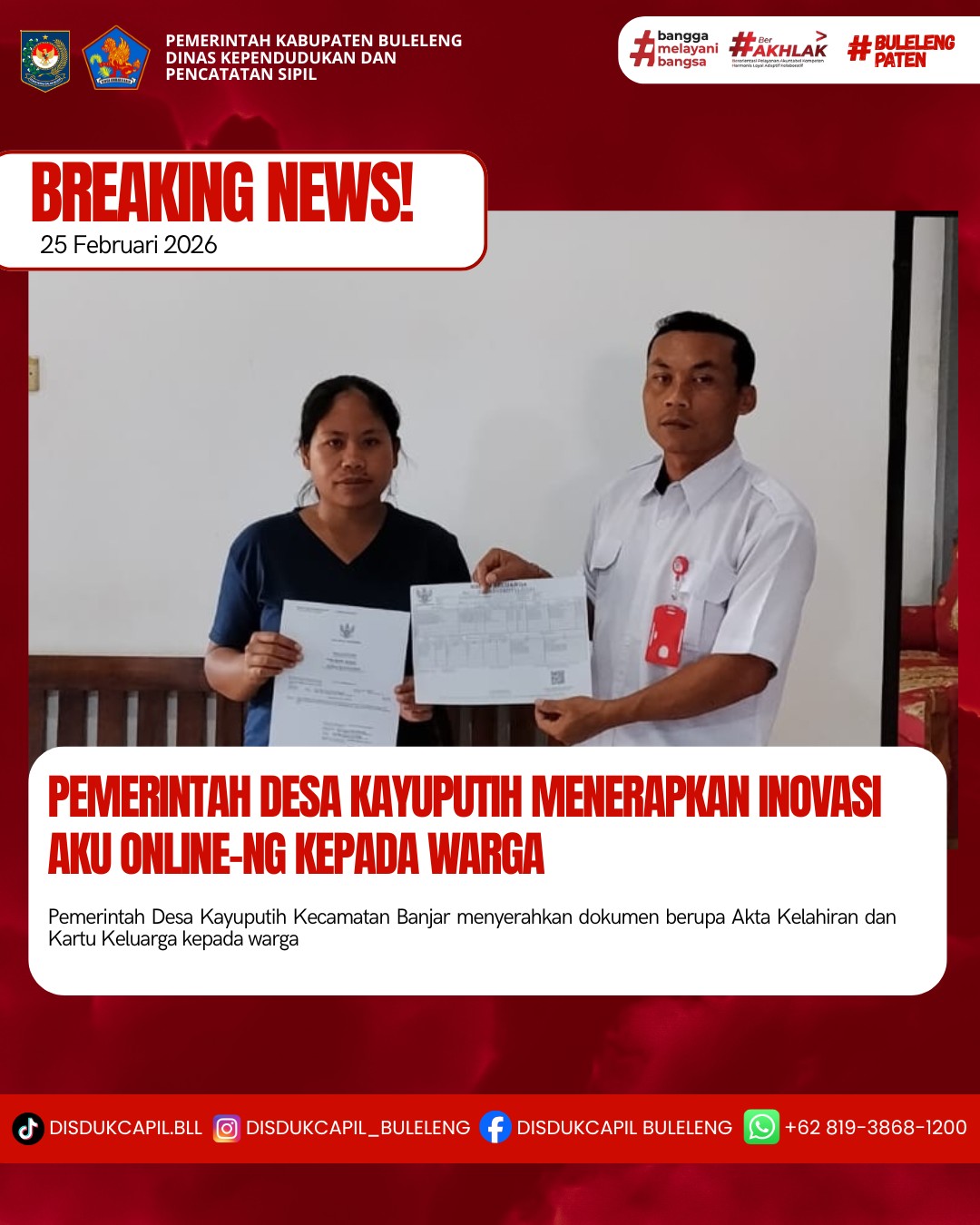 Pemerintah Kabupaten Buleleng melalui Dinas Kependudukan dan Pecatatan Sipil (Disdukcapil) Kabupaten Buleleng memaksimalkan serta mempermudah pelayanan kependudukan masyarakat dengan beberapa inovasi, melalui aplikasi AKU Online-NG. Dimana dalam penerapan aplikasi Aku Online-NG tersebut masyarakat tidak perlu lagi datang ke Dinas Dukcapil untuk melakukan pelayanan langsung cukup dengan datang ke Desa nanti akan dibantu oleh operator Desa masing-masing. Di Desa Kayuputih Kecamatan Banjar, telah diserahkan dokumen kependudukan berupa Akta Kelahiran dan Kartu Keluarga atas nama Putu Adi Suantara warga Banjar Dinas Bolangan Desa Kayuputih yang diserahkan secara langsung oleh Pemerintah Desa Kayuputih Kecamatan Banjar, Rabu (25/2).