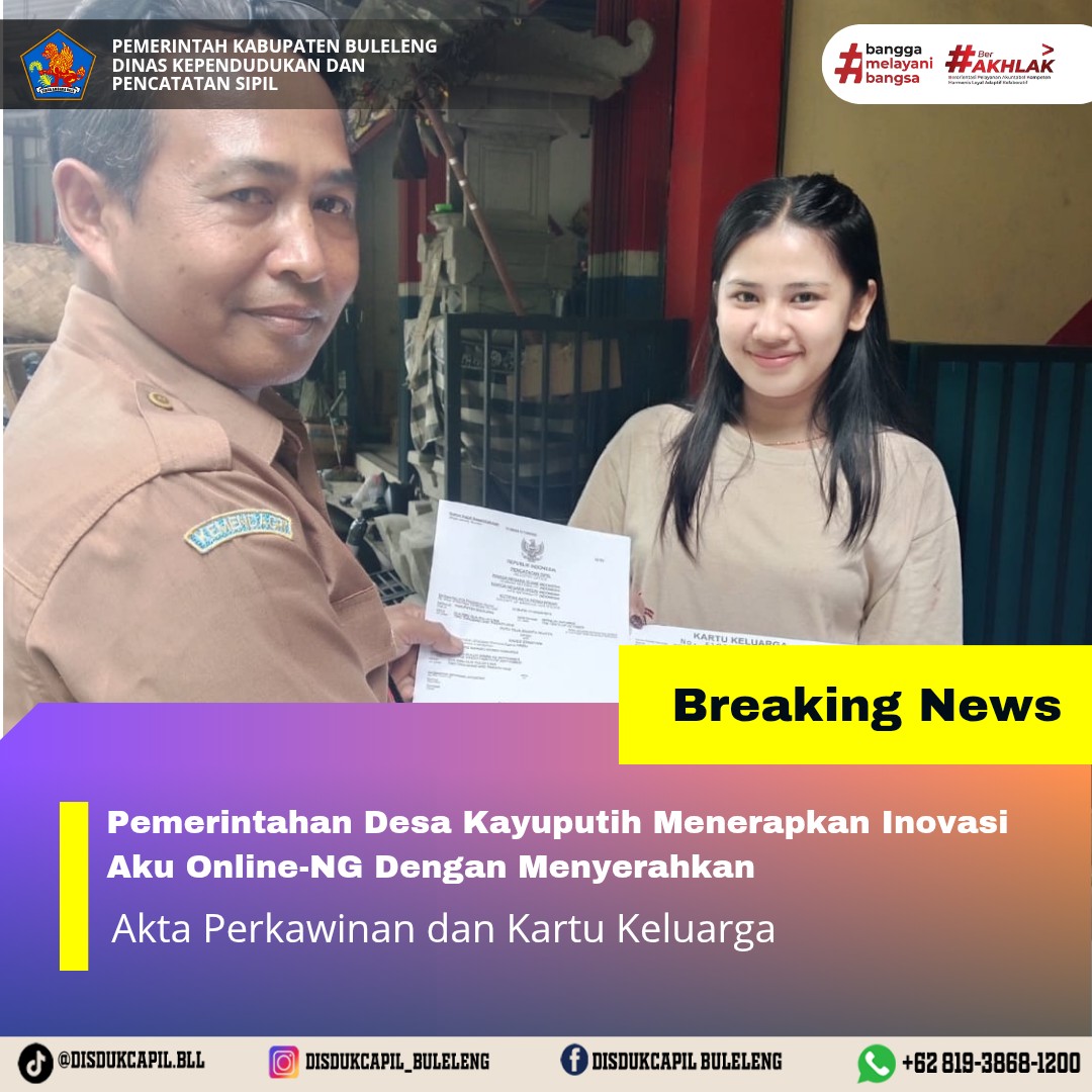 Pemerintah Kabupaten Buleleng melalui Dinas Kependudukan dan Pecatatan Sipil (Disdukcapil) Kabupaten Buleleng memaksimalkan serta mempermudah pelayanan kependudukan masyarakat dengan beberapa inovasi, melalui aplikasi AKU Online-NG. Dimana dalam penerapan aplikasi Aku Online-NG tersebut masyarakat tidak perlu lagi datang ke Dinas Dukcapil untuk melakukan pelayanan langsung cukup dengan datang ke Desa nanti akan dibantu oleh operator Desa masing-masing. Di Desa Kayuputih Kecamatan Banjar, telah diserahkan dokumen kependudukan berupa Akta Perkawinan dan Kartu Keluarga atas nama Putu Teje yang diserahkan secara langsung oleh Kelian Banjar Dinas Desa, Desa Kayuputih Kecamatan Banjar, Senin (13/10).