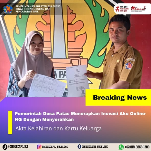 Pemerintah Kabupaten Buleleng melalui Dinas Kependudukan dan Pecatatan Sipil (Disdukcapil) Kabupaten Buleleng memaksimalkan serta mempermudah pelayanan kependudukan masyarakat dengan beberapa inovasi, melalui aplikasi AKU Online-NG. Dimana dalam penerapan aplikasi Aku Online-NG tersebut masyarakat tidak perlu lagi datang ke Dinas Dukcapil untuk melakukan pelayanan langsung cukup dengan datang ke Desa nanti akan dibantu oleh operator Desa masing-masing. Di Desa Patas Kecamatan Gerokgak, telah diserahkan dokumen kependudukan berupa Akta Kelahiran dan Kartu Keluarga atas nama Imam Safii yang diserahkan langsung oleh Pemerintahan Desa Patas Kecamatan Gerokgak, Senin (24/11).