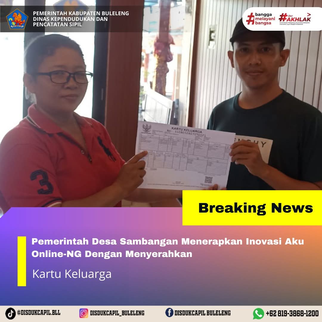 Pemerintah Kabupaten Buleleng melalui Dinas Kependudukan dan Pecatatan Sipil (Disdukcapil) Kabupaten Buleleng memaksimalkan serta mempermudah pelayanan kependudukan masyarakat dengan beberapa inovasi, melalui aplikasi AKU Online-NG. Dimana dalam penerapan aplikasi Aku Online-NG tersebut masyarakat tidak perlu lagi datang ke Dinas Dukcapil untuk melakukan pelayanan langsung cukup dengan datang ke Desa nanti akan dibantu oleh operator Desa masing-masing. Di Desa Sambangan Kecamatan Sukasada, telah diserahkan dokumen kependudukan berupa Kartu Keluarga atas nama Gede Wija yang diserahkan oleh Kasi Pemerintahan Desa Sambangan kepada warga Banjar Dinas Sambangan bertempat di Kantor Perbekel Desa Sambangan, Kecamatan Sukasada, Kabupaten Buleleng, Jumat (12/12).