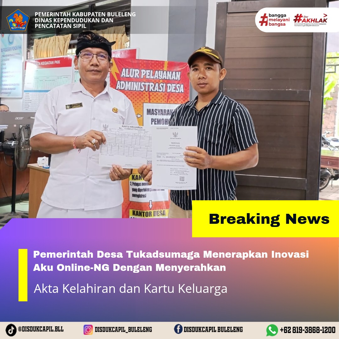 Pemerintah Kabupaten Buleleng melalui Dinas Kependudukan dan Pecatatan Sipil (Disdukcapil) Kabupaten Buleleng memaksimalkan serta mempermudah pelayanan kependudukan masyarakat dengan beberapa inovasi, melalui aplikasi AKU Online-NG. Dimana dalam penerapan aplikasi Aku Online-NG tersebut masyarakat tidak perlu lagi datang ke Dinas Dukcapil untuk melakukan pelayanan langsung cukup dengan datang ke Desa nanti akan dibantu oleh operator Desa masing-masing. Di Desa Tukadsumaga Kecamatan Gerokgak, telah diserahkan dokumen kependudukan berupa Akta Kelahiran dan Kartu Keluarga atas nama Ni Ketut Sumertini yang diserahkan oleh Sekretaris Desa Tukadsumaga kepada warga Banjar Dinas Gandongan Desa Tukadsumaga Kecamatan Gerokgak., Rabu (24/12).