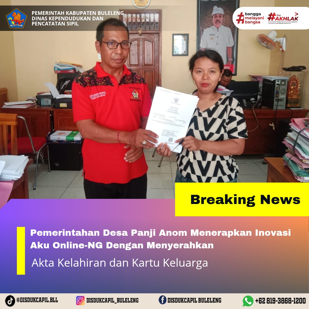 Pemerintah Kabupaten Buleleng melalui Dinas Kependudukan dan Pecatatan Sipil (Disdukcapil) Kabupaten Buleleng memaksimalkan serta mempermudah pelayanan kependudukan masyarakat dengan beberapa inovasi, melalui aplikasi AKU Online-NG. Dimana dalam penerapan aplikasi Aku Online-NG tersebut masyarakat tidak perlu lagi datang ke Dinas Dukcapil untuk melakukan pelayanan langsung cukup dengan datang ke Desa nanti akan dibantu oleh operator Desa masing-masing. Di Desa Panji Anom Kecamatan Sukasada, telah diserahkan dokumen kependudukan berupa Akta Kelahiran atas nama KETUT DIANA WULANDARI PUTRI dan Kartu Keluarga atas nama I PUTU ARNITA YASA yang diserahkan secara langsung oleh Kaur Keuangan Desa Panji Anom , Jumat (10/10).