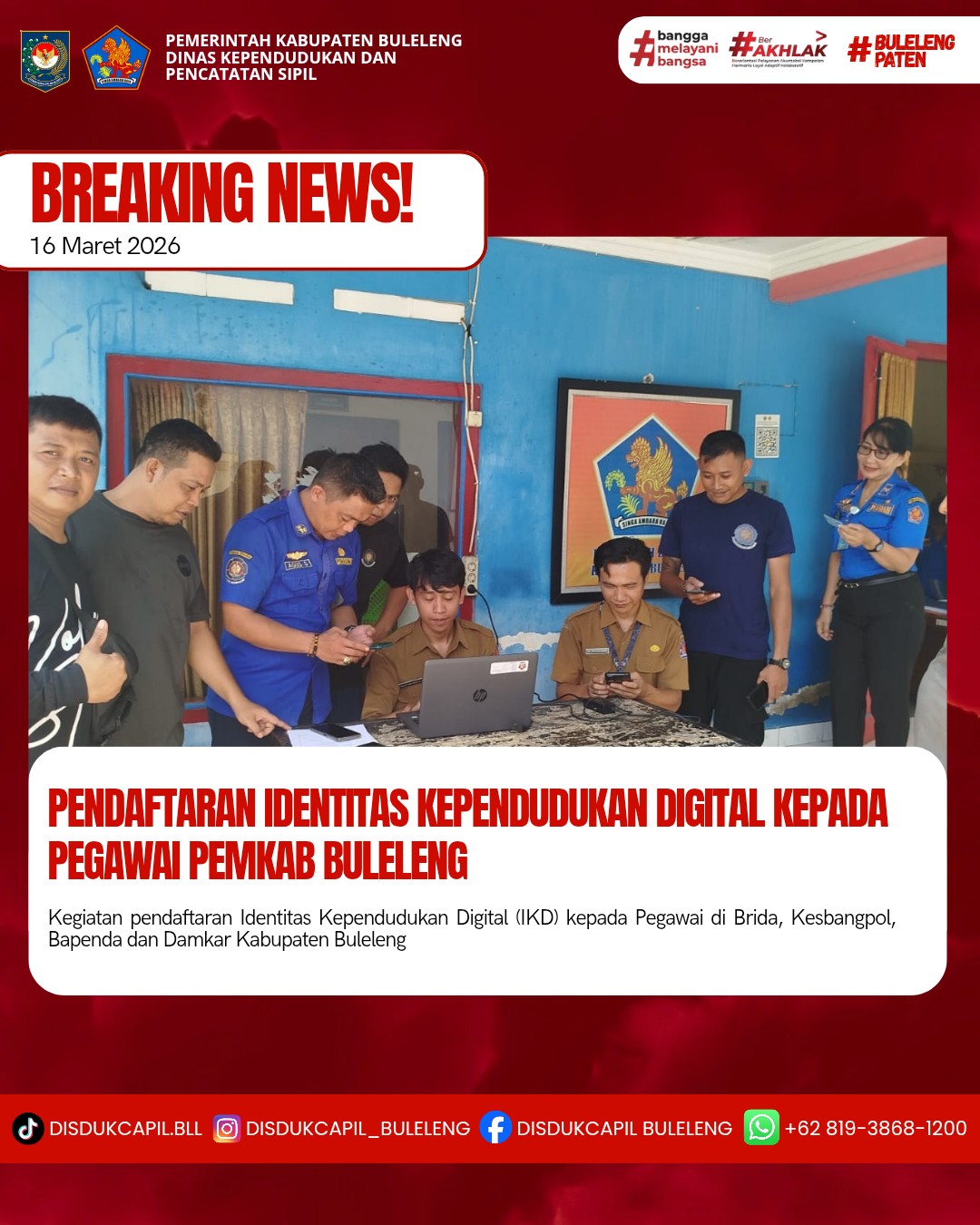 Menerapkan aturan pemerintah tersebut, Dinas Kependudukan dan Pencatatan Sipil Kabupaten Buleleng menyelenggarakan Pendaftaran Identitas Kependudukan Digital ke sekolah-sekolah, Dinas, Lembaga dan Perusahaan secara bergilir setiap harinya. Kali ini pelaksanaan pendaftaran Identitas Kependudukan Digital kepada Pegawai yang dilaksanakan di Brida, Kesbangpol, Bapenda dan Damkar Kabupaten Buleleng, Selasa (16/3).