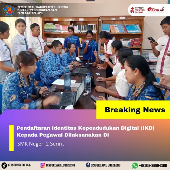 Menerapkan aturan pemerintah tersebut, Dinas Kependudukan dan Pencatatan Sipil Kabupaten Buleleng menyelenggarakan Pendaftaran Identitas Kependudukan Digital ke sekolah-sekolah, Dinas, Lembaga dan Perusahaan secara bergilir setiap harinya. Kali ini pelaksanaan pendaftaran Identitas Kependudukan Digital kepada siswa yang dilaksanakan di SMK Negeri 2 Seririt, Senin (1/12).
