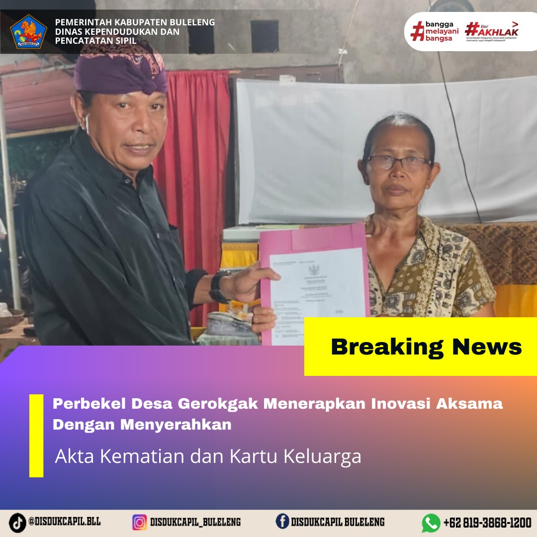 Pemerintah Kabupaten Buleleng melalui Dinas Kependudukan dan Pecatatan Sipil (Disdukcapil) Kabupaten Buleleng memaksimalkan serta mempermudah pelayanan kependudukan masyarakat dengan beberapa inovasi, yakni BALITA (Bayi Lahir Berakta), NYAKSI (Menyerahkan Akta Kawin Saat Acara Perkawinan) dan AKSAMA ( Akta Kematian Diserahkan Saat Masih Berduka) melalui aplikasi Aku Online-NG. Di Desa Gerokgak Kecamatan Gerokgak, telah diterapkan program Aksama (Akta Kematian Diserahkan Saat Masih Berduka) yang dilakukan secara langsung oleh Perbekel Desa Gerokgak I Nyoman Wijaya dengan menyerahkan Akta Kematian atas nama Ketut Kendri dan Kartu Keluarga kepada keluarga almarhum di rumah duka Banjar Dinas Batuagung Pidada, Desa Gerokgak, Senin (29/12).