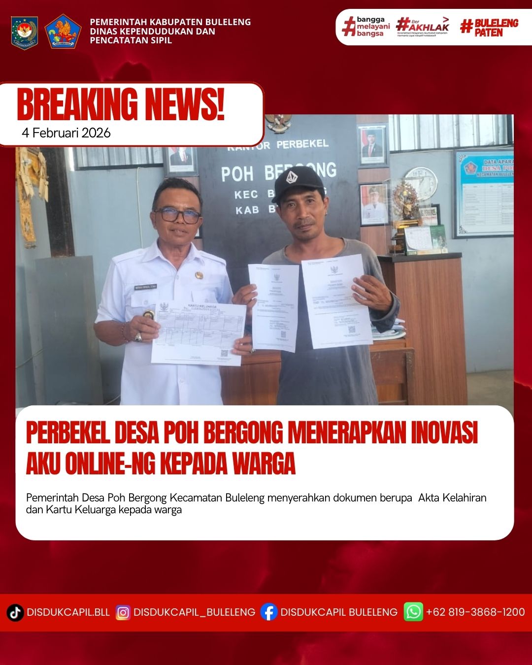 Pemerintah Kabupaten Buleleng melalui Dinas Kependudukan dan Pecatatan Sipil (Disdukcapil) Kabupaten Buleleng memaksimalkan serta mempermudah pelayanan kependudukan masyarakat dengan beberapa inovasi, melalui aplikasi AKU Online. Dimana dalam penerapan aplikasi Aku Online tersebut masyarakat tidak perlu lagi datang ke Dinas Dukcapil untuk melakukan pelayanan langsung cukup dengan datang ke Desa nanti akan dibantu oleh operator Desa masing-masing. Di Desa Poh Bergong Kecamatan Buleleng telah diserahkan dokumen kependudukan berupa Akta Kelahiran dan Kartu Keluarga yang diserahkan langsung oleh Perbekel Desa Poh Bergong Kecamatan Buleleng Wayan Wagia, S.Sos, Rabu (4/2).