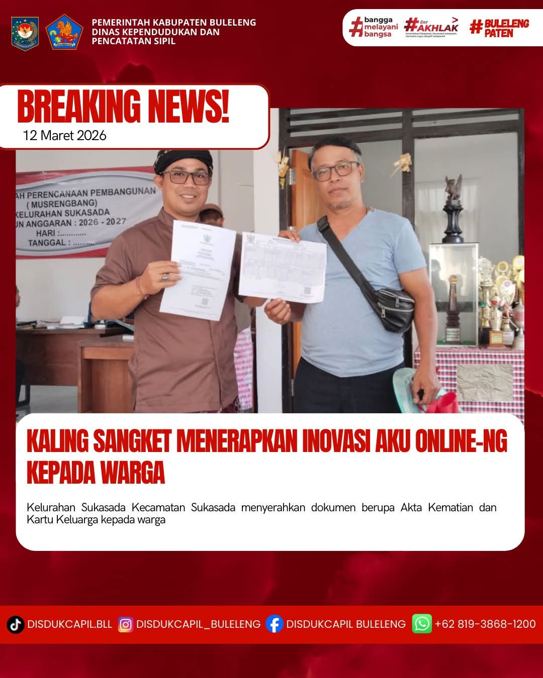 Pemerintah Kabupaten Buleleng melalui Dinas Kependudukan dan Pecatatan Sipil (Disdukcapil) Kabupaten Buleleng memaksimalkan serta mempermudah pelayanan kependudukan masyarakat dengan beberapa inovasi, melalui aplikasi AKU Online-NG. Dimana dalam penerapan aplikasi Aku Online-NG tersebut masyarakat tidak perlu lagi datang ke Dinas Dukcapil untuk melakukan pelayanan langsung cukup dengan datang ke Desa nanti akan dibantu oleh operator Desa masing-masing. Di Kelurahan Sukasada Kecamatan Sukasada, telah diserahkan dokumen kependudukan berupa Akta Kematian dan Kartu Keluarga atas nama Ketut Karya warga Lingkungan Sangket, Kelurahan Sukasada yang diserahkan langsung oleh Kepala Lingkungan Sangket Kelurahan Sukasada Kecamatan Sukasada, Kabupaten Buleleng, Kamis (12/3).