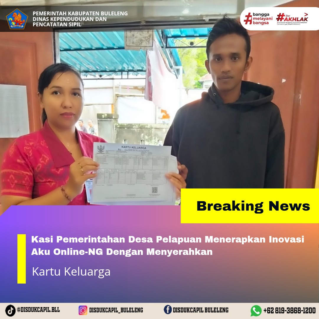 Pemerintah Kabupaten Buleleng melalui Dinas Kependudukan dan Pecatatan Sipil (Disdukcapil) Kabupaten Buleleng memaksimalkan serta mempermudah pelayanan kependudukan masyarakat dengan beberapa inovasi, melalui aplikasi AKU Online-NG. Dimana dalam penerapan aplikasi Aku Online-NG tersebut masyarakat tidak perlu lagi datang ke Dinas Dukcapil untuk melakukan pelayanan langsung cukup dengan datang ke Desa nanti akan dibantu oleh operator Desa masing-masing. Di Desa Pelapuan Kecamatan Busungbiu, telah diserahkan dokumen kependudukan berupa Kartu Keluarga atas nama Dewa Suastama yang diserahkan oleh Kasi Pemerintahan Desa Pelapuan kepada warga bertempat di Kantor Perbekel Desa Pelapuan, Kecamatan Busungbiu, Kabupaten Buleleng, Selasa (23/12).