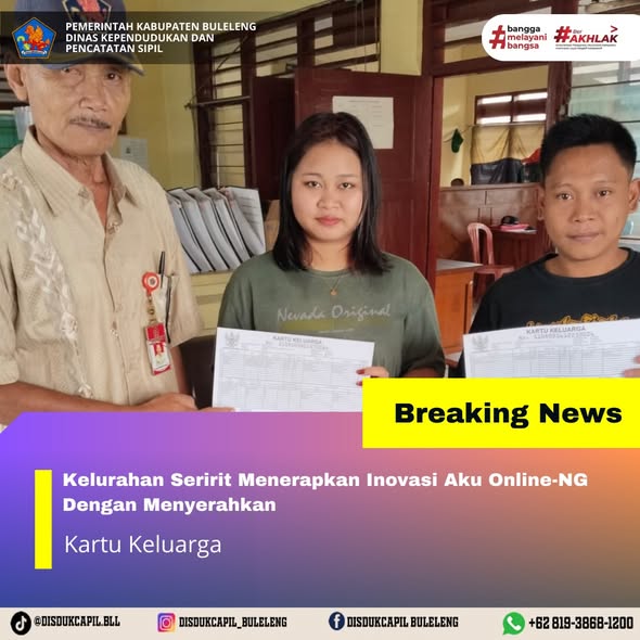 Pemerintah Kabupaten Buleleng melalui Dinas Kependudukan dan Pecatatan Sipil (Disdukcapil) Kabupaten Buleleng memaksimalkan serta mempermudah pelayanan kependudukan masyarakat dengan beberapa inovasi, melalui aplikasi AKU Online-NG. Dimana dalam penerapan aplikasi Aku Online-NG tersebut masyarakat tidak perlu lagi datang ke Dinas Dukcapil untuk melakukan pelayanan langsung cukup dengan datang ke Desa nanti akan dibantu oleh operator Desa masing-masing. Di Kelurahan Seririt Kecamatan Seririt, telah diserahkan dokumen kependudukan berupa Kartu Keluarga atas nama Zakaria yang diserahkan langsung oleh Kepala Lingkungan 3 Kelurahan Seririt Kecamatan Seririt, Kabupaten Buleleng, Selasa (16/12).