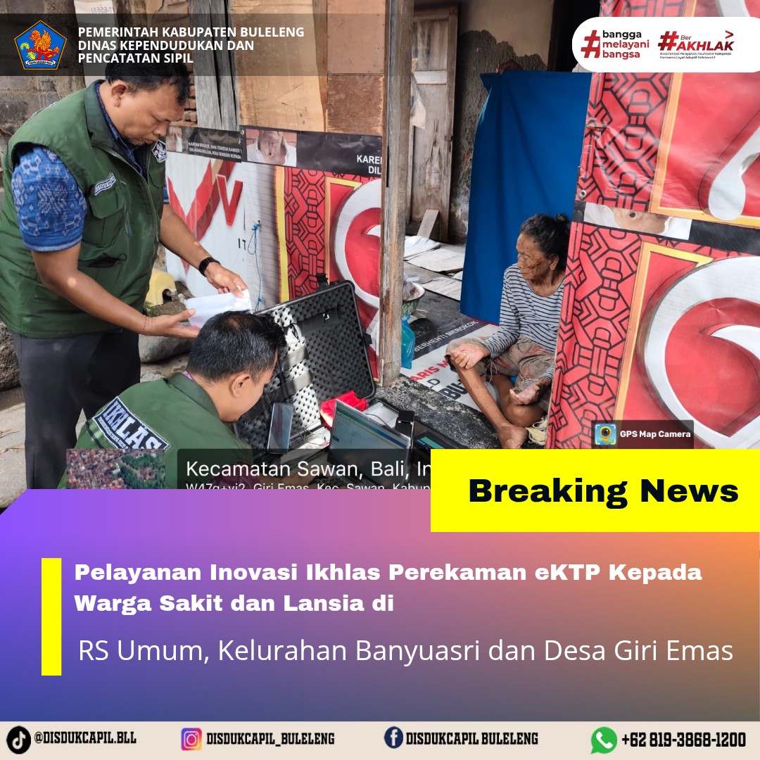 Dinas Kependudukan dan Pencatatan Sipil Kabupaten Buleleng terus berupaya memberikan pelayanan maksimal pada masyarakat dalam rangka meningkatkan kesadaran kepada masyarakat akan pentingnya memiliki dokumen kependudukan salah satunya Kartu Tanda Penduduk (KTP). Berbagai macam inovasi dikembangkan untuk mempermudah masyarakat dapat memiliki dokumen kependudukan. Salah satu Inovasi yang diberikan kepada masyarakat adalah Inovasi "IKHLAS" (Tim Khusus Layanan Untuk Orang Sakit dan Disabilitas) yaitu jembut bola perekaman KTP-el ke rumah warga yang tidak bisa datang langsung ke Kantor Disdukcapil untuk melakukan perekaman eKTP. Sesuai dengan Undang-Undang Republik Indonesia Nomor 24 Tahun 2013 tentang Administrasi Kependudukan, menyatakan bahwa Penduduk Warga Negara Indonesia dan Orang Asing yang memiliki Izin Tinggal Tetap yang telah berumur 17 (tujuh belas) tahun atau telah kawin atau pernah kawin wajib memiliki KTP-el. Namun demikian, ada beberapa penduduk yang tidak bisa datang langsung ke Kantor Dinas Kependudukan dan Pencatatan Sipil Kabupaten Buleleng karena kendala kesehatan dan usia lanjut.