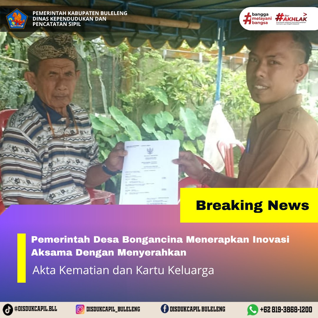 Pemerintah Kabupaten Buleleng melalui Dinas Kependudukan dan Pecatatan Sipil (Disdukcapil) Kabupaten Buleleng memaksimalkan serta mempermudah pelayanan kependudukan masyarakat dengan beberapa inovasi, yakni BALITA (Bayi Lahir Berakta), NYAKSI (Menyerahkan Akta Kawin Saat Acara Perkawinan) dan AKSAMA ( Akta Kematian Diserahkan Saat Masih Berduka) melalui aplikasi Aku Online. Di Desa Bongancina Kecamatan Busungbiu, telah diterapkan program Aksama (Akta Kematian Diserahkan Saat Masih Berduka) yang dilakukan secara langsung oleh Operator Desa Bongancina dengan menyerahkan Akta Kematian atas nama Putu Sinar dan Kartu Keluarga kepada warga di Desa Bongancina Kecamatan Busungbiu, Jumat (17/10).