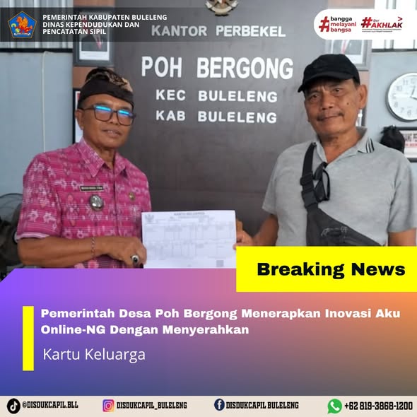 Pemerintah Kabupaten Buleleng melalui Dinas Kependudukan dan Pecatatan Sipil (Disdukcapil) Kabupaten Buleleng memaksimalkan serta mempermudah pelayanan kependudukan masyarakat dengan beberapa inovasi, melalui aplikasi AKU Online. Dimana dalam penerapan aplikasi Aku Online tersebut masyarakat tidak perlu lagi datang ke Dinas Dukcapil untuk melakukan pelayanan langsung cukup dengan datang ke Desa nanti akan dibantu oleh operator Desa masing-masing. Di Desa Poh Bergong Kecamatan Buleleng telah diserahkan dokumen kependudukan berupa dan Kartu Keluarga kepada warga atas nama Wayan Sedana Desa Poh Bergong Kecamatan Buleleng diserahkan oleh Perbekel Desa Poh Bergong, Kamis (30/10).