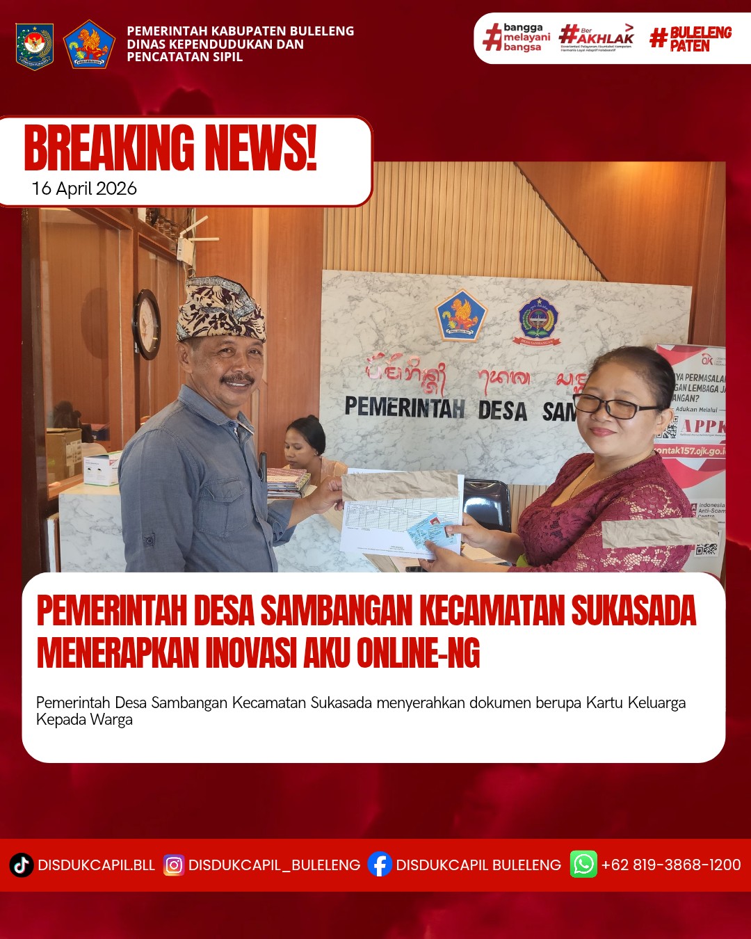 Pemerintah Kabupaten Buleleng melalui Dinas Kependudukan dan Pecatatan Sipil (Disdukcapil) Kabupaten Buleleng memaksimalkan serta mempermudah pelayanan kependudukan masyarakat dengan beberapa inovasi, melalui aplikasi AKU Online-NG. Dimana dalam penerapan aplikasi Aku Online-NG tersebut masyarakat tidak perlu lagi datang ke Dinas Dukcapil untuk melakukan pelayanan langsung, cukup dengan datang ke Desa nanti akan dibantu oleh operator Desa masing-masing. Di Desa Sambangan Kecamatan Sukasada, telah diserahkan dokumen kependudukan berupa Kartu Keluarga atas nama Darma Arya Suta warga BD. Babakan diserahkan oleh Kasi Pemerintahan Desa Sambangan yang bertempat di Kantor Perbekel Desa Sambangan, Kecamatan Sukasada, Kabupaten Buleleng, Kamis (16/4).