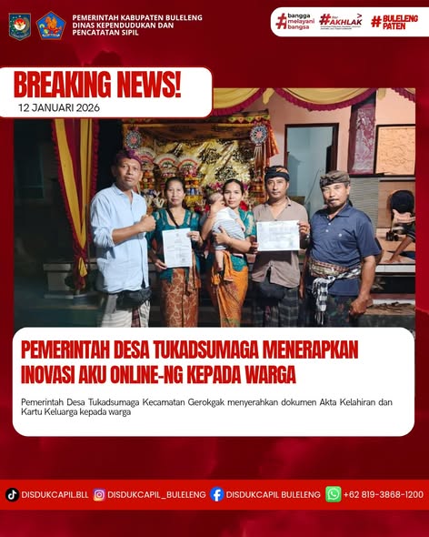 Pemerintah Kabupaten Buleleng melalui Dinas Kependudukan dan Pecatatan Sipil (Disdukcapil) Kabupaten Buleleng memaksimalkan serta mempermudah pelayanan kependudukan masyarakat dengan beberapa inovasi, melalui aplikasi AKU Online-NG. Dimana dalam penerapan aplikasi Aku Online-NG tersebut masyarakat tidak perlu lagi datang ke Dinas Dukcapil untuk melakukan pelayanan langsung cukup dengan datang ke Desa nanti akan dibantu oleh operator Desa masing-masing. Di Desa Tukadsumaga Kecamatan Gerokgak, telah diserahkan dokumen kependudukan berupa Akta Kelahiran atas nama I KOMANG DENDRA AGASTYA PUTRA dan Kartu Keluarga atas nama I KADEK AGUS SUARSANA warga Banjar Dinas Gandongan Cendana Desa Tukadsumaga Kecamatan Gerokgak yang diserahkan oleh Kelian Banjar Dinas Gandongan Cendana Desa Tukadsumaga di Desa Tukadsumaga, Sabtu (10/1).