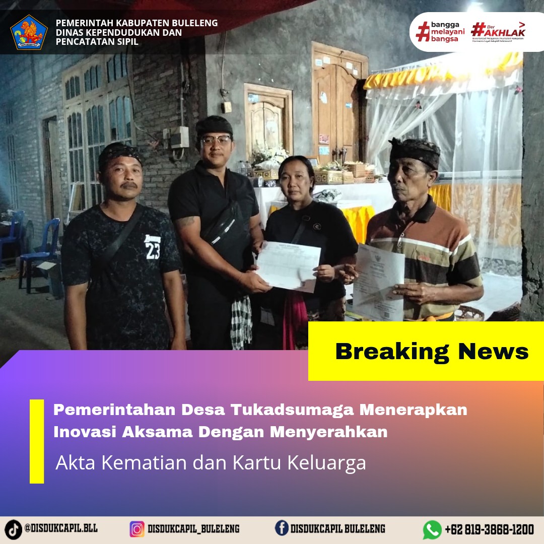 Pemerintah Kabupaten Buleleng melalui Dinas Kependudukan dan Pecatatan Sipil (Disdukcapil) Kabupaten Buleleng memaksimalkan serta mempermudah pelayanan kependudukan masyarakat dengan beberapa inovasi, yakni BALITA (Bayi Lahir Berakta), NYAKSI (Menyerahkan Akta Kawin Saat Acara Perkawinan) dan AKSAMA ( Akta Kematian Diserahkan Saat Masih Berduka) melalui aplikasi Aku Online. Di Desa Tukadsumaga Kecamatan Gerokgak, telah diterapkan program Aksama (Akta Kematian Diserahkan Saat Masih Berduka) yang dilakukan secara langsung oleh Pemerintah Desa Tukadsumaga dengan menyerahkan Akta Kematian atas nama Ni Made Swari dan Kartu Keluarga atas nama I Wayan Wirat di Desa Tukadusumaga Kecamatan Gerokgak, Senin (22/9).