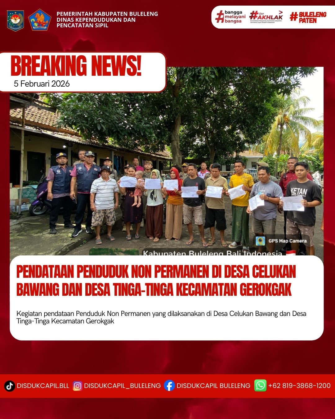 Kali ini Kamis, 5 Februari 2026, Dinas Kependudukan dan Pencatatan Sipil Kabupaten Buleleng melaksanakan kegiatan pendataan penduduk Non Permanen di Desa Celukan Bawang dan Desa Tinga-Tinga Kecamatan Gerokgak. Dari pendataan penduduk kali ini didapatkan hasil :