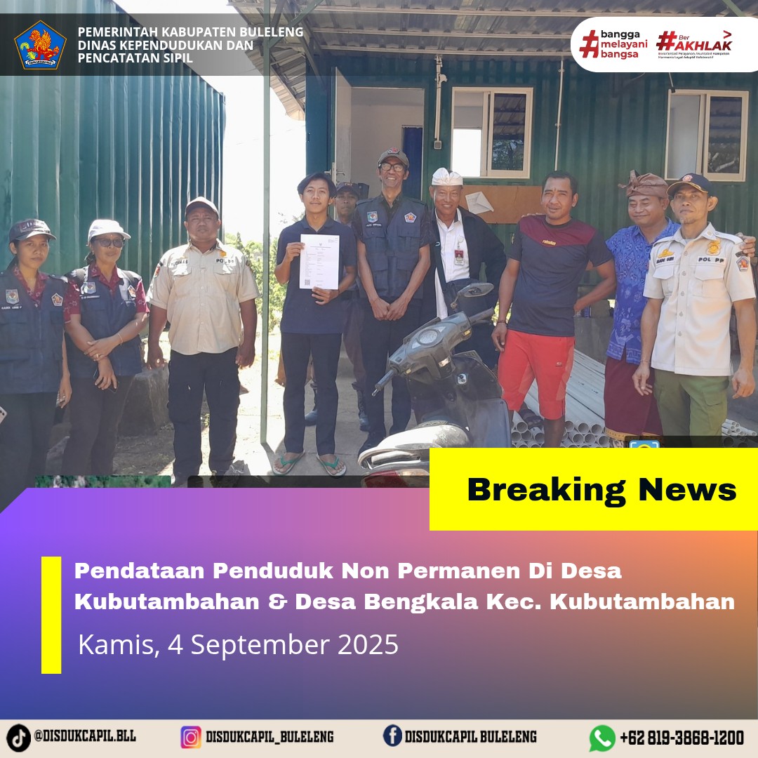 Kali ini Kamis, 4 September 2025, Dinas Kependudukan dan Pencatatan Sipil Kabupaten Buleleng melaksanakan kegiatan pendataan penduduk Non Permanen di Desa Kubutambahan dan Desa Bengkala Kecamatan Kubutambahan. Dari pendataan penduduk kali ini didapatkan hasil :