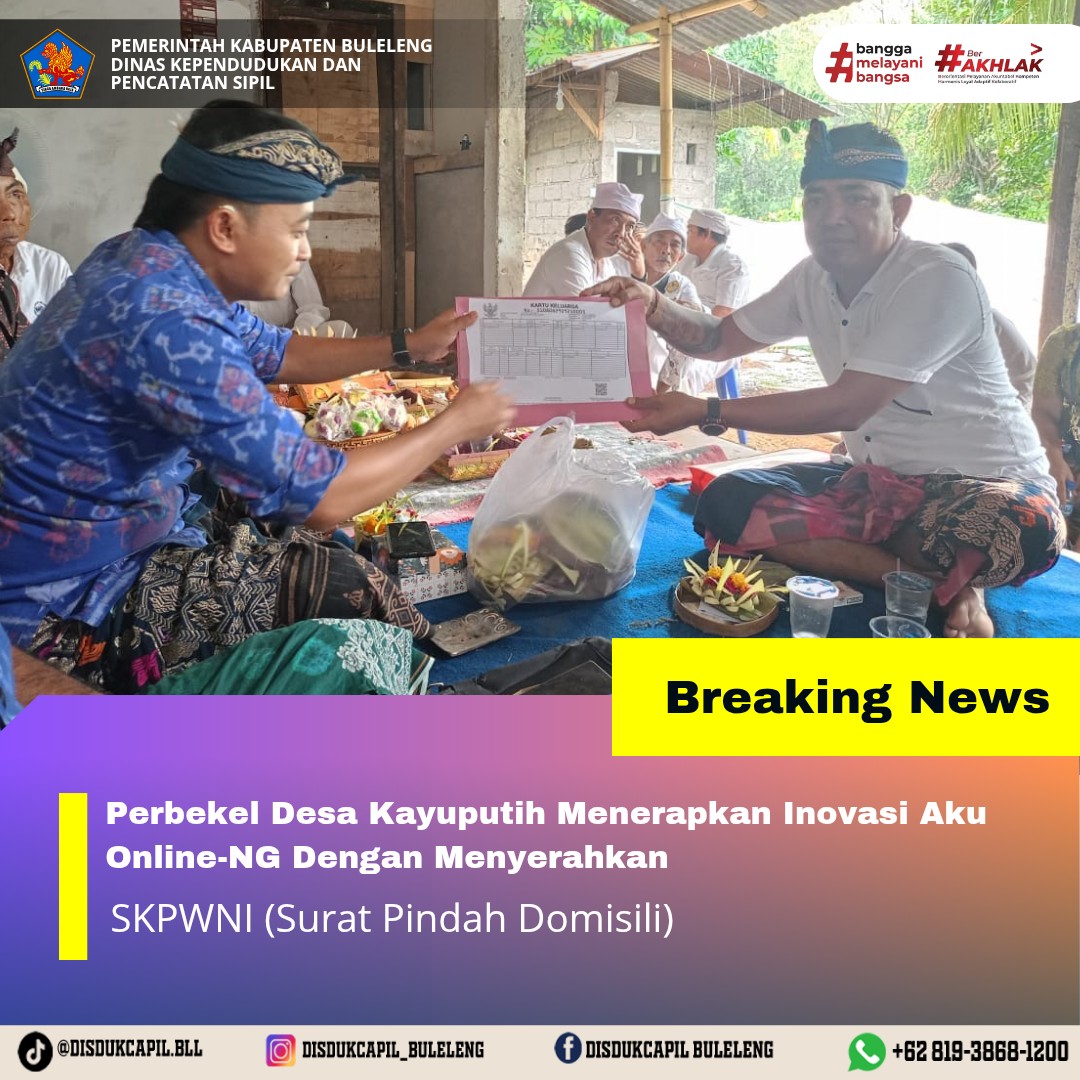 Pemerintah Kabupaten Buleleng melalui Dinas Kependudukan dan Pecatatan Sipil (Disdukcapil) Kabupaten Buleleng memaksimalkan serta mempermudah pelayanan kependudukan masyarakat dengan beberapa inovasi, melalui aplikasi AKU Online. Dimana dalam penerapan aplikasi Aku Online tersebut masyarakat tidak perlu lagi datang ke Dinas Dukcapil untuk melakukan pelayanan langsung cukup dengan datang ke Desa nanti akan dibantu oleh operator Desa masing-masing. Di Desa Kayuputih Kecamatan Sukasada telah diserahkan dokumen kependudukan berupa SKPWNI antar Kecamatan atas nama Luh Gede Aria Wati yang diserahkan oleh Perbekel Desa Kayuputih Kecamatan Sukasada Gede Gelgel Ariawan kepada warga yang akan pindah menikah ke Desa Kubutambahan, Senin (29/9).
