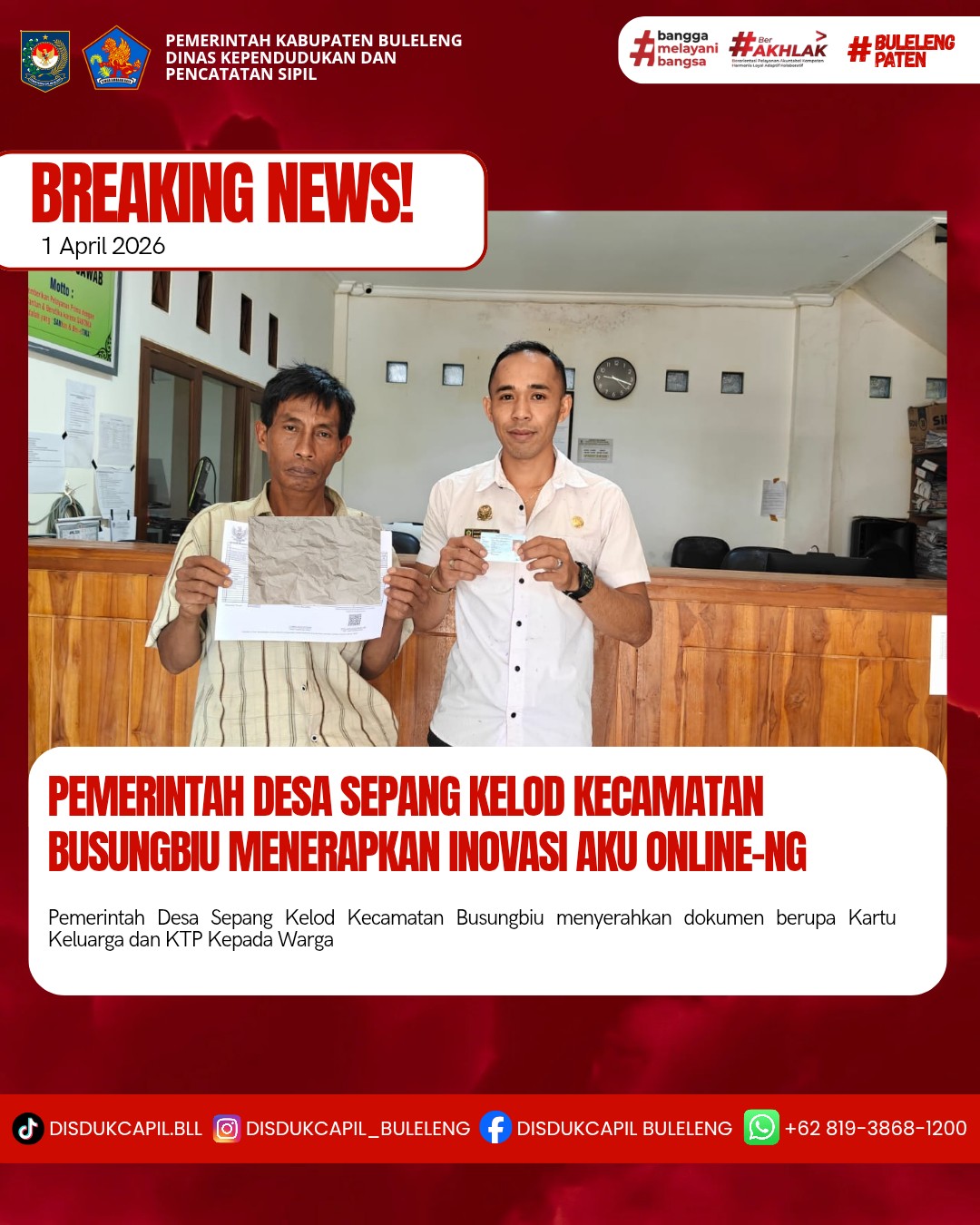 Pemerintah Kabupaten Buleleng melalui Dinas Kependudukan dan Pecatatan Sipil (Disdukcapil) Kabupaten Buleleng memaksimalkan serta mempermudah pelayanan kependudukan masyarakat dengan beberapa inovasi, melalui aplikasi AKU Online. Dimana dalam penerapan aplikasi Aku Online tersebut masyarakat tidak perlu lagi datang ke Dinas Dukcapil untuk melakukan pelayanan langsung, cukup dengan datang ke Desa nanti akan dibantu oleh operator Desa masing-masing. Di Desa Sepang Kelod Kecamatan Busungbiu telah diserahkan dokumen kependudukan berupa Kartu Keluarga dan KTP warga Banjar Dinas Bujak, Desa Sepang kelod Kecamatan Busungbiu yang diserahkan oleh Sekretaris Desa Sepang Kelod, bertempat di Kantor Perbekel Desa Sepang Kelod, Kecamatan Busungbiu, Rabu (1/4).