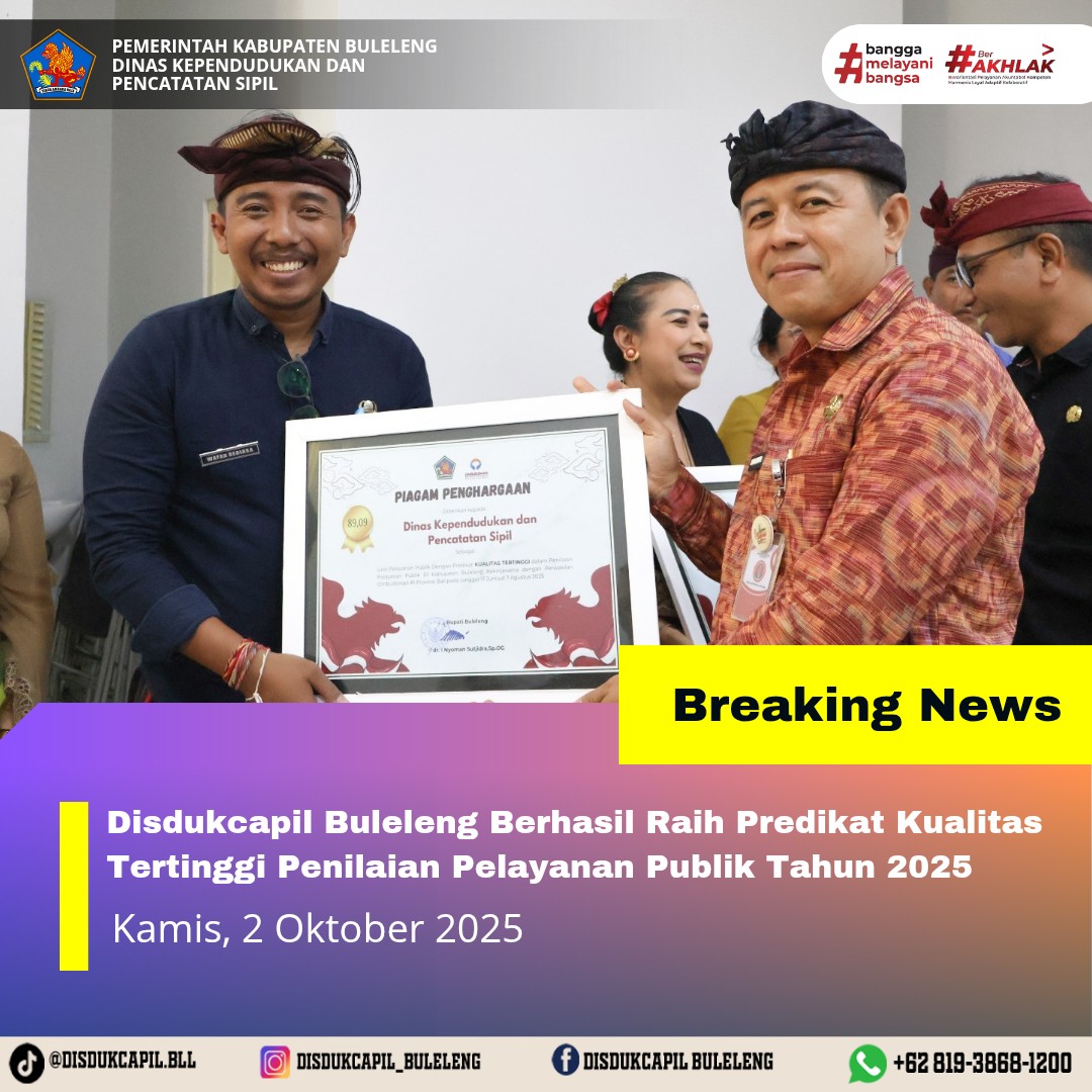 Dinas Kependudukan dan Pencatatan Sipil (Disdukcapil) Kabupaten Buleleng berhasil meraih predikat kualitas tertinggi dalam pelayanan publik. Penilaian ini diberikan melalui kerja sama Pemerintah Kabupaten Buleleng dengan Ombudsman RI Perwakilan Provinsi Bali. Penghargaan tersebut menjadi bukti komitmen Disdukcapil Buleleng dalam meningkatkan mutu layanan administrasi kependudukan yang cepat, transparan, dan berorientasi pada masyarakat. Kepala Disdukcapil Buleleng menyampaikan bahwa pencapaian ini tidak lepas dari upaya berkelanjutan dalam membangun sistem pelayanan yang lebih mudah diakses serta responsif terhadap kebutuhan warga. Pemerintah Kabupaten Buleleng mengapresiasi prestasi ini dan berharap capaian tersebut dapat menjadi motivasi bagi seluruh perangkat daerah untuk terus meningkatkan kualitas pelayanan publik di Buleleng.