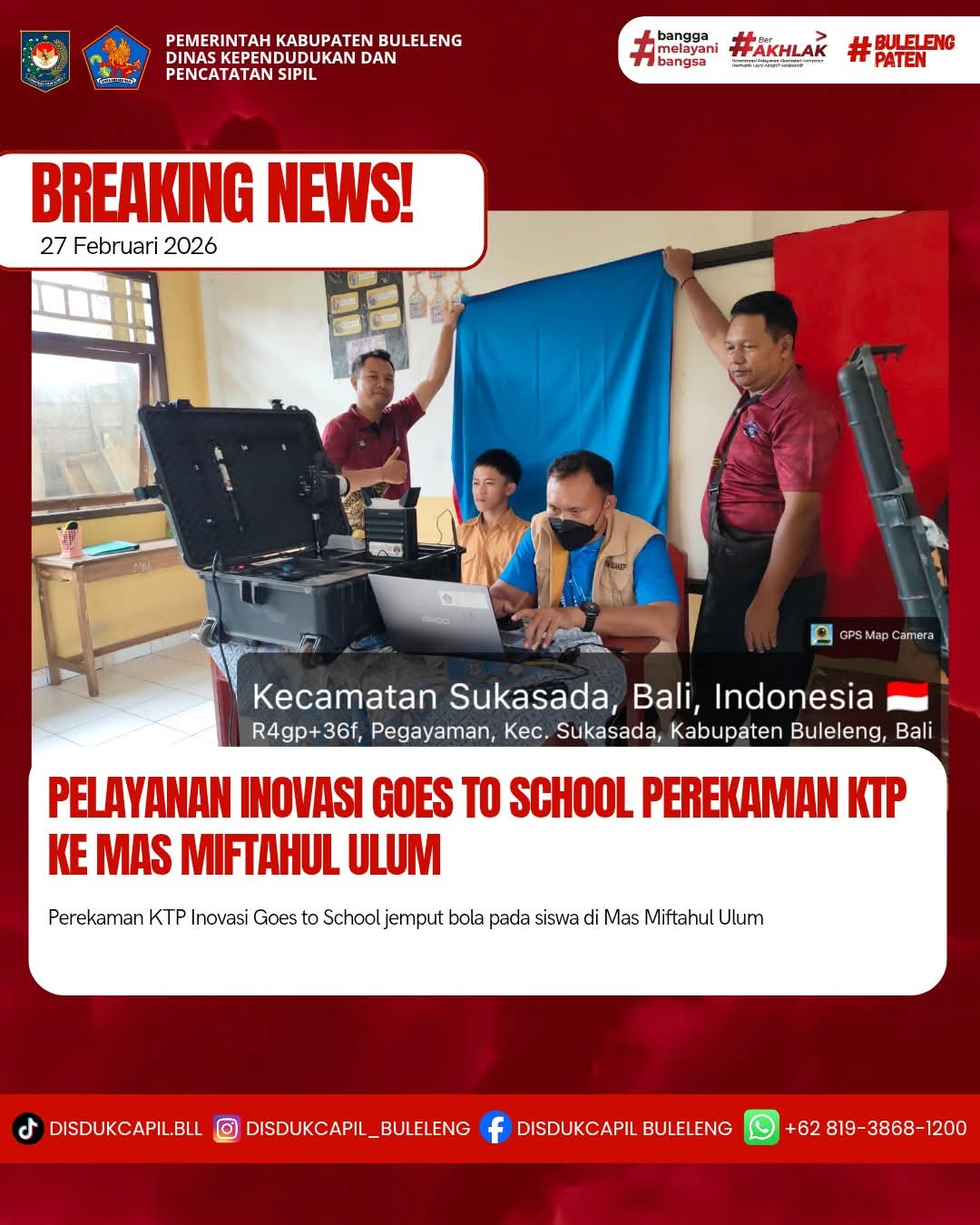 Pada kali ini Jumat, 27 Februari 2026 pelayanan perekaman KTP-el dilaksanakan di Mas Miftahul Ulum. Hasil perekaman di Mas Miftahul Ulum dengan data BNBA sebanyak 32 orang dan total yang melakukan perekaman sebanyak 31 orang, dimana hasil perekaman data di dalam BNBA sebanyak 28 orang dan data di luar BNBA sebanyak 3 orang yang melakukan perekaman. Dilihat dari hasil tersebut sisa data BNBA yang belum perekaman sebanyak 4 orang keterangan dari pihak sekolah data BNBA yang belum perekaman karena tidak sekolah.