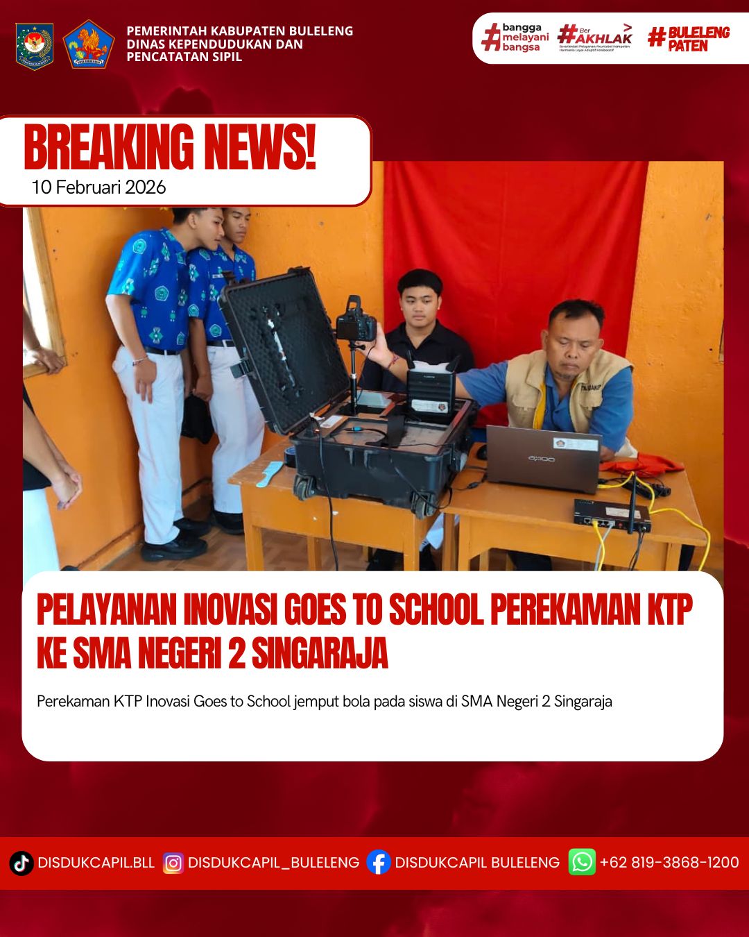 Pada kali ini Selasa, 10 Februari 2026 pelayanan perekaman KTP-el dilaksanakan di SMA Negeri 2 Singaraja. Hasil perekaman di SMA Negeri 2 Singaraja dengan data BNBA sebanyak 251 orang dan total yang melakukan perekaman sebanyak 122 orang, dimana hasil perekaman data di dalam BNBA sebanyak 118 orang dan data di luar BNBA sebanyak 4 orang yang melakukan perekaman. Dilihat dari hasil tersebut sisa data BNBA yang belum perekaman sebanyak 133 orang keterangan dari pihak sekolah siswa yang belum perekaman dilanjutkan di hari selanjutnya.
