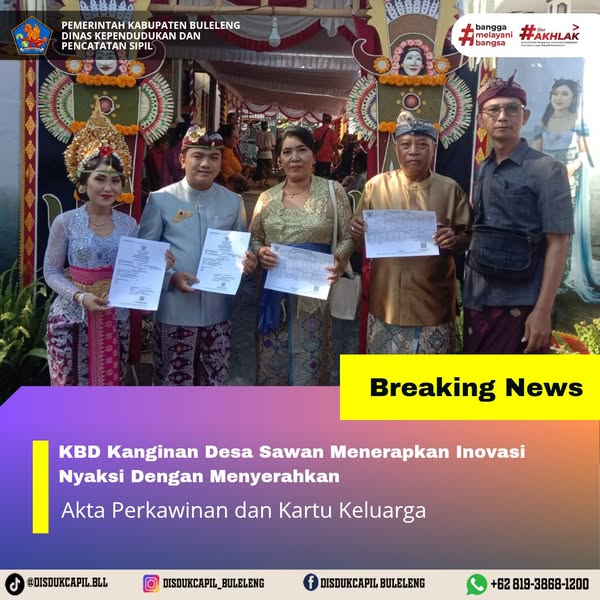 Pemerintah Kabupaten Buleleng melalui Dinas Kependudukan dan Pecatatan Sipil (Disdukcapil) Kabupaten Buleleng memaksimalkan serta mempermudah pelayanan kependudukan masyarakat dengan beberapa inovasi, yakni BALITA (Bayi Lahir Berakta), NYAKSI (Menyerahkan Akta Kawin Saat Acara Perkawinan) dan AKSAMA ( Akta Kematian Diserahkan Saat Masih Berduka) melalui aplikasi Aku Online-NG. Di Desa Sawan Kecamatan Sawan, telah diterapkan program NYAKSI (Menyerahkan Akta Perkawinan Saat Acara Perkawinan) yang dilakukan secara langsung oleh Kelian Banjar Dinas Kanginan Desa Sawan dengan menyerahkan Akta Perkawinan atas nama Gede Aditya Nareswara dan Kartu Keluarga kepada kedua mempelai dan masing-masing orang tua mempelai, Rabu (24/9).