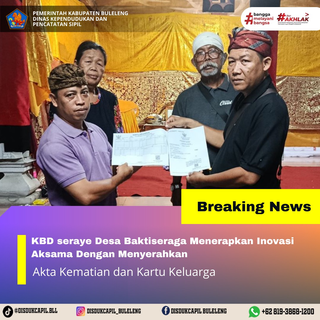 Pemerintah Kabupaten Buleleng melalui Dinas Kependudukan dan Pecatatan Sipil (Disdukcapil) Kabupaten Buleleng memaksimalkan serta mempermudah pelayanan kependudukan masyarakat dengan beberapa inovasi, yakni BALITA (Bayi Lahir Berakta), NYAKSI (Menyerahkan Akta Kawin Saat Acara Perkawinan) dan AKSAMA ( Akta Kematian Diserahkan Saat Masih Berduka) melalui aplikasi Aku Online. Di Desa Baktiseraga Kecamatan Buleleng, telah diterapkan program Aksama (Akta Kematian Diserahkan Saat Masih Berduka) yang dilakukan secara langsung oleh Kelian Banjar Dinas Seraya dan Anggota BPD Desa Baktiseraga dengan menyerahkan Akta Kematian atas nama I GST PUTU ARDANA dan Kartu Keluarga atas nama JRO MD ARINI yang beralamat di Desa Baktiseraga, Senin (17/11).