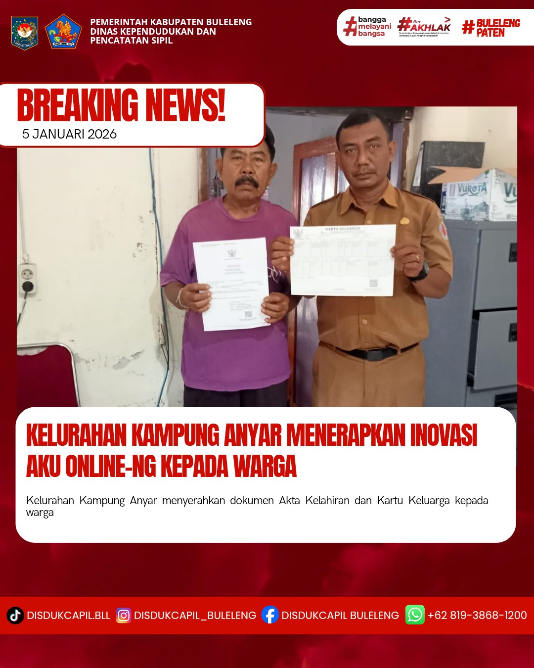 Pemerintah Kabupaten Buleleng melalui Dinas Kependudukan dan Pecatatan Sipil (Disdukcapil) Kabupaten Buleleng memaksimalkan serta mempermudah pelayanan kependudukan masyarakat dengan beberapa inovasi, melalui aplikasi AKU Online-NG. Dimana dalam penerapan aplikasi Aku Online-NG tersebut masyarakat tidak perlu lagi datang ke Dinas Dukcapil untuk melakukan pelayanan langsung cukup dengan datang ke Desa nanti akan dibantu oleh operator Desa masing-masing. Di Kelurahan Kampung Anyar Kecamatan Buleleng, telah diserahkan dokumen kependudukan berupa Akta Kelahiran dan Kartu Keluarga atas nama Ni Komang Sinten yang diserahkan langsung oleh Kelurahan Kampung Anyar Kecamatan Buleleng, Kabupaten Buleleng, Senin (5/1).