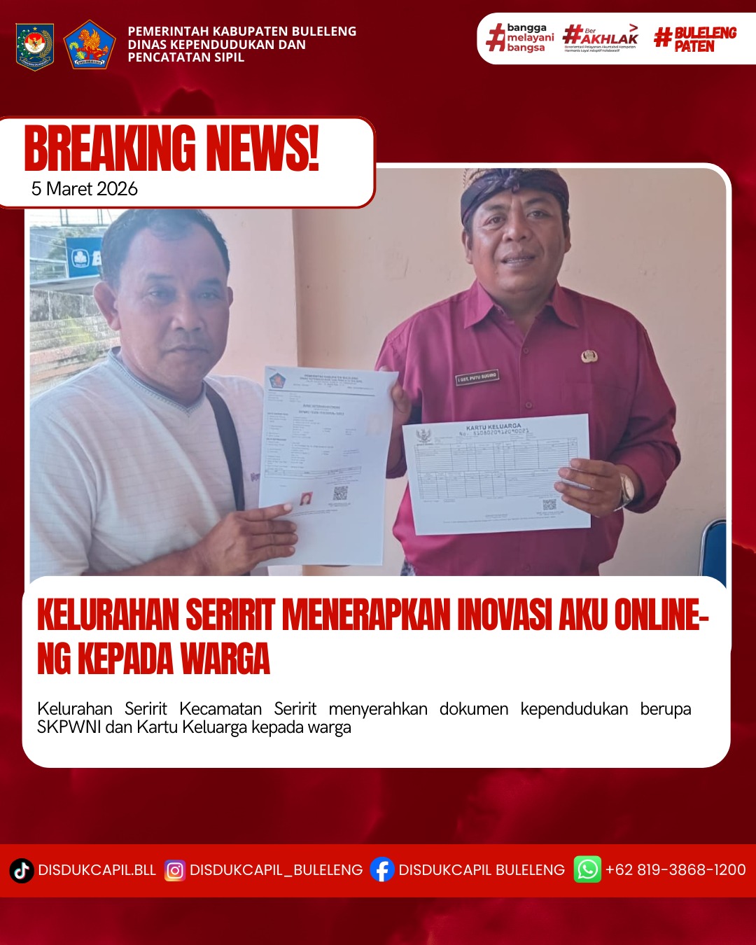 Pemerintah Kabupaten Buleleng melalui Dinas Kependudukan dan Pecatatan Sipil (Disdukcapil) Kabupaten Buleleng memaksimalkan serta mempermudah pelayanan kependudukan masyarakat dengan beberapa inovasi, melalui aplikasi AKU Online-NG. Dimana dalam penerapan aplikasi Aku Online-NG tersebut masyarakat tidak perlu lagi datang ke Dinas Dukcapil untuk melakukan pelayanan langsung cukup dengan datang ke Desa nanti akan dibantu oleh operator Desa masing-masing. Di Kelurahan Seririt Kecamatan Seririt, telah diserahkan dokumen kependudukan berupa SKPWNI atas nama Ketut Ayu Hartayani dan Kartu Keluarga atas nama Komang Pustaka Anom yang diserahkan langsung oleh Lurah Seririt Putu Sugiarto, S.Sos,. M.AP., di Kecamatan Seririt, Kabupaten Buleleng, Kamis (5/3).