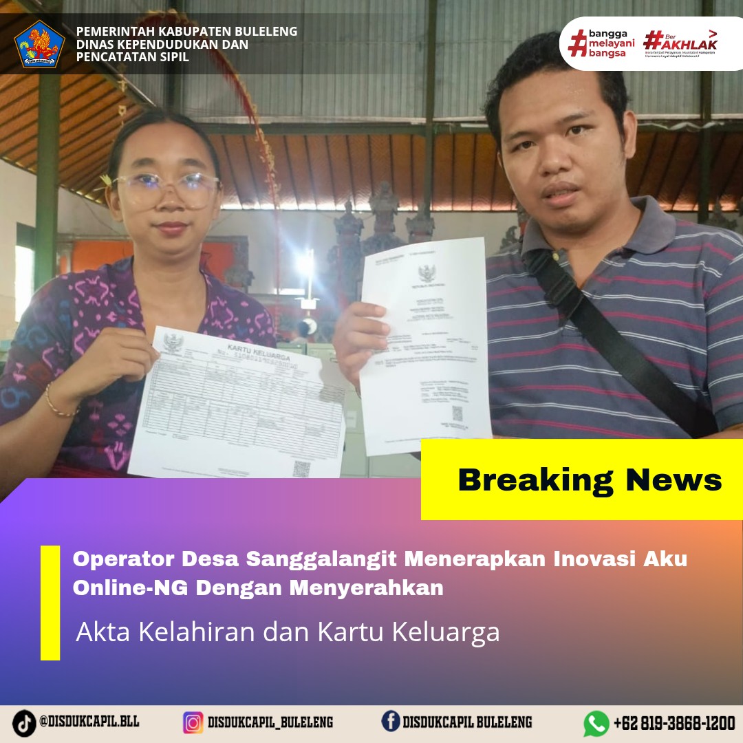 Pemerintah Kabupaten Buleleng melalui Dinas Kependudukan dan Pecatatan Sipil (Disdukcapil) Kabupaten Buleleng memaksimalkan serta mempermudah pelayanan kependudukan masyarakat dengan beberapa inovasi, melalui aplikasi AKU Online. Dimana dalam penerapan aplikasi Aku Online tersebut masyarakat tidak perlu lagi datang ke Dinas Dukcapil untuk melakukan pelayanan langsung cukup dengan datang ke Desa nanti akan dibantu oleh operator Desa masing-masing. Di Desa Sanggalangit Kecamatan Gerokgak telah diserahkan dokumen kependudukan berupa Akta Kelahiran dan Kartu Keluarga kepada warga Banjar Dinas Tukadpule Desa Sanggalangit atas nama Gede Pajar Budi Wardana yang diserahkan oleh Operator Desa Sanggalangit Kecamatan Gerokgak, Jumat (31/10).