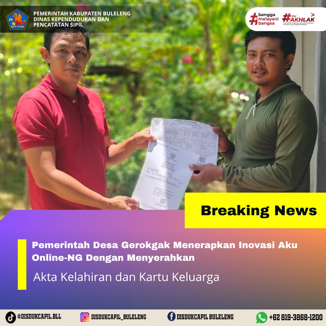 Pemerintah Kabupaten Buleleng melalui Dinas Kependudukan dan Pecatatan Sipil (Disdukcapil) Kabupaten Buleleng memaksimalkan serta mempermudah pelayanan kependudukan masyarakat dengan beberapa inovasi, melalui aplikasi AKU Online. Dimana dalam penerapan aplikasi Aku Online tersebut masyarakat tidak perlu lagi datang ke Dinas Dukcapil untuk melakukan pelayanan langsung cukup dengan datang ke Desa nanti akan dibantu oleh operator Desa masing-masing. Di Desa Gerokgak Kecamatan Gerokgak telah diserahkan dokumen kependudukan berupa Akta Kelahiran atas nama Komang Arik Susanti dan Kartu Keluarga atas nama Komang Ardika yang diserahkan oleh Kelian Banjar Dinas Batuagung Pidada Kadek Suwirtajaya di Desa Gerokgak Kecamatan Gerokgak, Selasa (28/10).