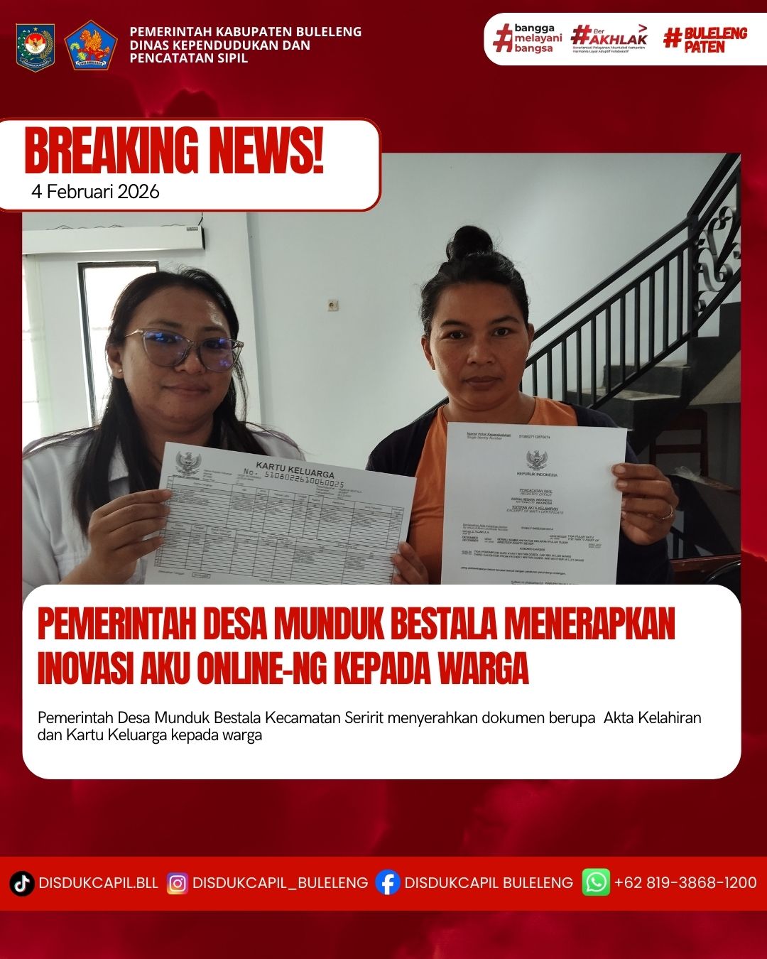Pemerintah Kabupaten Buleleng melalui Dinas Kependudukan dan Pecatatan Sipil (Disdukcapil) Kabupaten Buleleng memaksimalkan serta mempermudah pelayanan kependudukan masyarakat dengan beberapa inovasi, yakni BALITA (Bayi Lahir Berakta), NYAKSI (Menyerahkan Akta Kawin Saat Acara Perkawinan) dan AKSAMA ( Akta Kematian Diserahkan Saat Masih Berduka) melalui aplikasi Aku Online-NG. Di Desa Munduk Bestala Kecamatan Seririt, telah diterapkan program Aksama (Akta Kematian Diserahkan Saat Masih Berduka) yang dilakukan secara langsung oleh Kelian Banjar Dinas Sekar Desa Munduk Bestala Kecamatan Seririt dengan menyerahkan Akta Kelahiran dan Kartu Keluarga kepada warga atas nama Komang Darsini di Desa Munduk Bestala, Rabu (4/2).