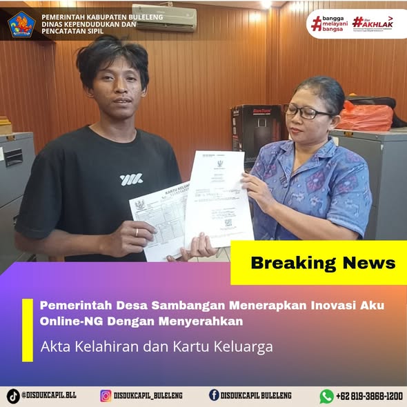 Pemerintah Kabupaten Buleleng melalui Dinas Kependudukan dan Pecatatan Sipil (Disdukcapil) Kabupaten Buleleng memaksimalkan serta mempermudah pelayanan kependudukan masyarakat dengan beberapa inovasi, melalui aplikasi AKU Online-NG. Dimana dalam penerapan aplikasi Aku Online-NG tersebut masyarakat tidak perlu lagi datang ke Dinas Dukcapil untuk melakukan pelayanan langsung cukup dengan datang ke Desa nanti akan dibantu oleh operator Desa masing-masing. Di Desa Sambangan Kecamatan Sukasada, telah diserahkan dokumen kependudukan berupa Akta Kelahiran atas nama Kadek Darma Yasa dan Kartu Keluarga atas nama Putu Sri Adi Darma yang diserahkan oleh Kasi Pemerintahan Desa Sambangan kepada warga Banjar Dinas Sambangan bertempat di Kantor Perbekel Desa Sambangan, Kecamatan Sukasada, Kabupaten Buleleng, Selasa (16/12).