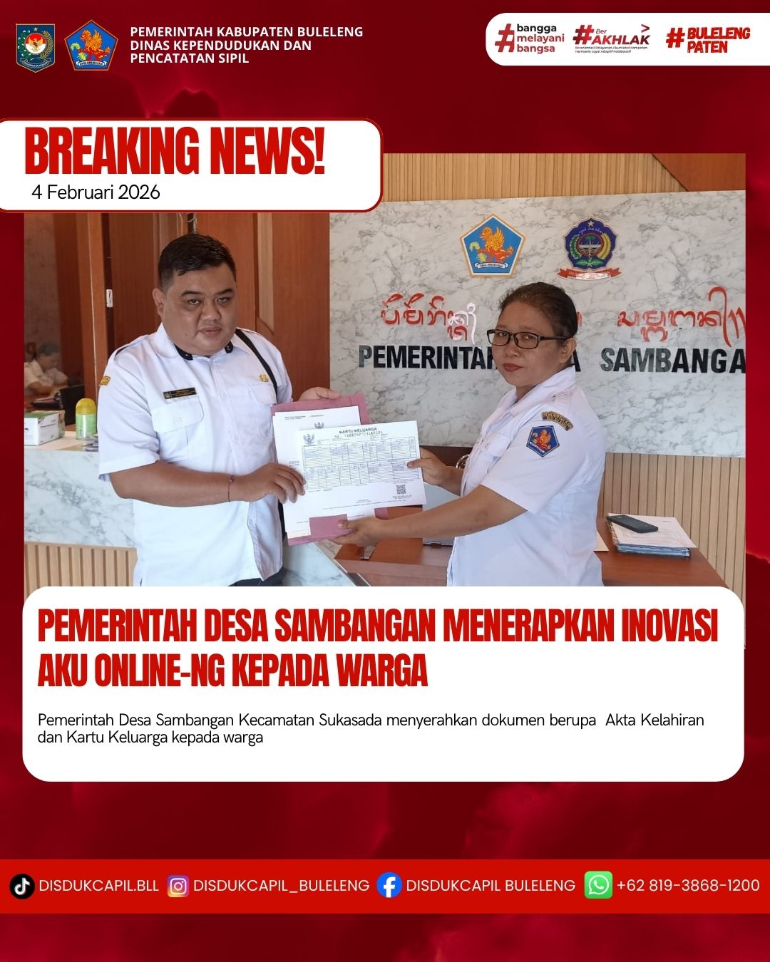 Pemerintah Kabupaten Buleleng melalui Dinas Kependudukan dan Pecatatan Sipil (Disdukcapil) Kabupaten Buleleng memaksimalkan serta mempermudah pelayanan kependudukan masyarakat dengan beberapa inovasi, melalui aplikasi AKU Online-NG. Dimana dalam penerapan aplikasi Aku Online-NG tersebut masyarakat tidak perlu lagi datang ke Dinas Dukcapil untuk melakukan pelayanan langsung cukup dengan datang ke Desa nanti akan dibantu oleh operator Desa masing-masing. Di Desa Sambangan Kecamatan Sukasada, telah diserahkan dokumen kependudukan berupa Akta Kelahiran atas nama Kadek Ananda Kirana Putri dan Kartu Keluarga atas nama Made Budiyasa diserahkan oleh Kasi Pemerintahan Desa Sambangan bertempat di Kantor Perbekel Desa Sambangan, Kecamatan Sukasada, Kabupaten Buleleng, Rabu (4/2).