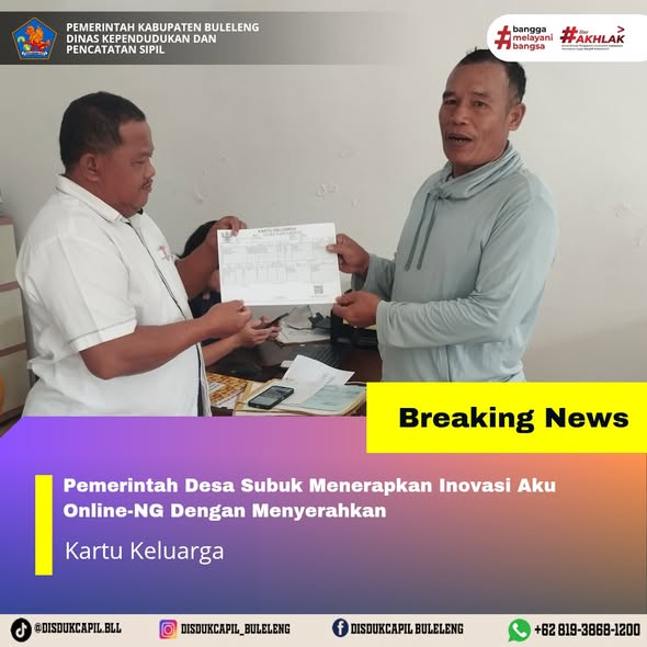 Pemerintah Kabupaten Buleleng melalui Dinas Kependudukan dan Pecatatan Sipil (Disdukcapil) Kabupaten Buleleng memaksimalkan serta mempermudah pelayanan kependudukan masyarakat dengan beberapa inovasi, melalui aplikasi AKU Online-NG. Dimana dalam penerapan aplikasi Aku Online-NG tersebut masyarakat tidak perlu lagi datang ke Dinas Dukcapil untuk melakukan pelayanan langsung cukup dengan datang ke Desa nanti akan dibantu oleh operator Desa masing-masing. Di Desa Subuk Kecamatan Busungbiu, telah diserahkan dokumen kependudukan berupa Kartu Keluarga atas nama Made sudika yang diserahkan langsung oleh Perbekel Desa Subuk Ketut Suliada Kusana bertempat di Kantor Perbekel Desa Subuk, Kecamatan Busungbiu, Kabupaten Buleleng, Rabu(24/12).