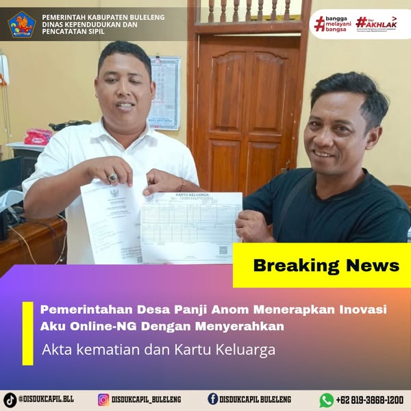 Pemerintah Kabupaten Buleleng melalui Dinas Kependudukan dan Pecatatan Sipil (Disdukcapil) Kabupaten Buleleng memaksimalkan serta mempermudah pelayanan kependudukan masyarakat dengan beberapa inovasi, melalui aplikasi AKU Online-NG. Dimana dalam penerapan aplikasi Aku Online-NG tersebut masyarakat tidak perlu lagi datang ke Dinas Dukcapil untuk melakukan pelayanan langsung cukup dengan datang ke Desa nanti akan dibantu oleh operator Desa masing-masing. Di Desa Panji Anom Kecamatan Sukasada, telah diserahkan dokumen kependudukan berupa Akta Kematian atas nama MADE SUCI dan Kartu Keluarga atas nama PUTU DARMA SANTIKA diserahkan secara langsung oleh Kadus Batupulu Desa Panji Anom, Rabu (17/9).