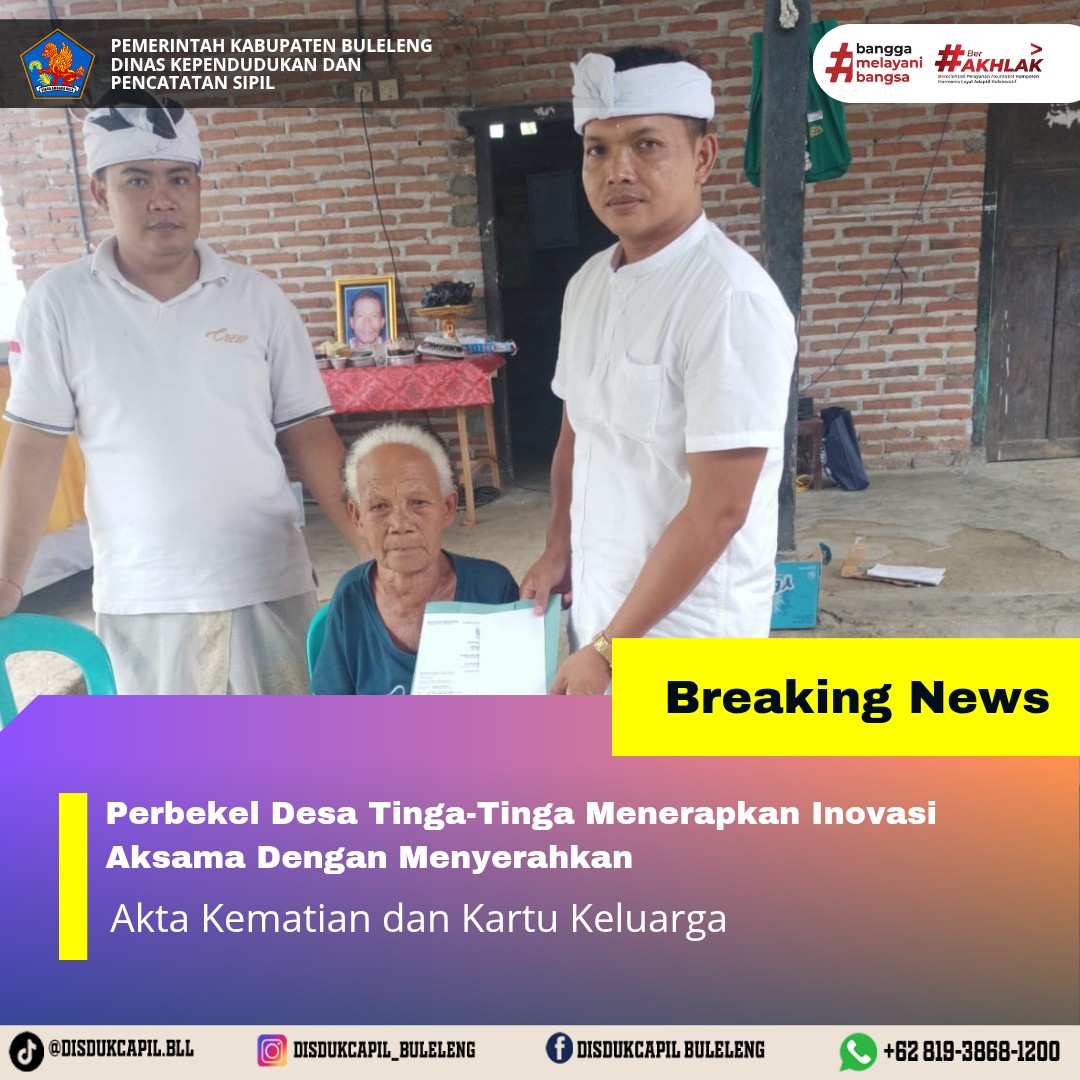 Pemerintah Kabupaten Buleleng melalui Dinas Kependudukan dan Pecatatan Sipil (Disdukcapil) Kabupaten Buleleng memaksimalkan serta mempermudah pelayanan kependudukan masyarakat dengan beberapa inovasi, yakni BALITA (Bayi Lahir Berakta), NYAKSI (Menyerahkan Akta Kawin Saat Acara Perkawinan) dan AKSAMA ( Akta Kematian Diserahkan Saat Masih Berduka) melalui aplikasi Aku Online. Di Desa Tinga-Tinga Kecamatan Gerokgak, telah diterapkan program Aksama (Akta Kematian Diserahkan Saat Masih Berduka) yang dilakukan secara langsung oleh Perbekel Desa Tinga-Tinga I Komang Adi Wirawan didampingi oleh KBD Mertasari Made Merta Ariawan dengan menyerahkan Akta Kematian atas nama NYOMAN SUADNYA dan Kartu Keluarga atas nama KETUT GABRUG kepada warga di Banjar Dinas Mertasari, Desa Tinga-tinga, Kecamatan Gerokgak, Selasa (21/10).
