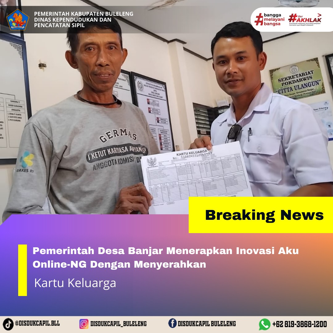 Pemerintah Kabupaten Buleleng melalui Dinas Kependudukan dan Pecatatan Sipil (Disdukcapil) Kabupaten Buleleng memaksimalkan serta mempermudah pelayanan kependudukan masyarakat dengan beberapa inovasi, melalui aplikasi AKU Online-NG. Dimana dalam penerapan aplikasi Aku Online-NG tersebut masyarakat tidak perlu lagi datang ke Dinas Dukcapil untuk melakukan pelayanan langsung cukup dengan datang ke Desa nanti akan dibantu oleh operator Desa masing-masing. Di Desa Banjar Kecamatan Banjar, telah diserahkan dokumen kependudukan berupa Kartu Keluarga atas nama IDA BAGUS PUTU SUASMIKA yang beralamat di Banjar Dinas Pegentengan, Desa Banjar yang diserahkan langsung oleh Pemerintahan Desa Banjar, Rabu (20/8).