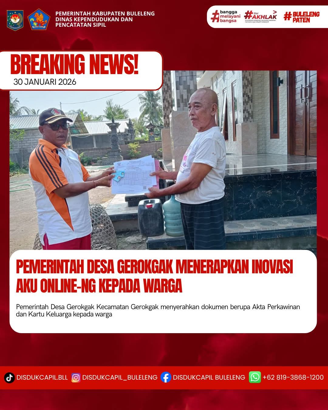 Pemerintah Kabupaten Buleleng melalui Dinas Kependudukan dan Pecatatan Sipil (Disdukcapil) Kabupaten Buleleng memaksimalkan serta mempermudah pelayanan kependudukan masyarakat dengan beberapa inovasi, melalui aplikasi AKU Online-NG. Dimana dalam penerapan aplikasi Aku Online-NG tersebut masyarakat tidak perlu lagi datang ke Dinas Dukcapil untuk melakukan pelayanan langsung cukup dengan datang ke Desa nanti akan dibantu oleh operator Desa masing-masing. Di Desa Gerokgak Kecamatan Gerokgak, telah diserahkan dokumen kependudukan berupa Akta Perkawinan atas nama Gede Juliasta Rasniasa dan Kartu Keluarga atas nama Gede Juliasta Rasniasa dan Putu Suardika yang diserahkan langsung oleh Kelian Banjar Dinas Tamansari Desa Gerokgak Kecamatan Gerokgak, Kabupaten Buleleng, Jumat (30/1).