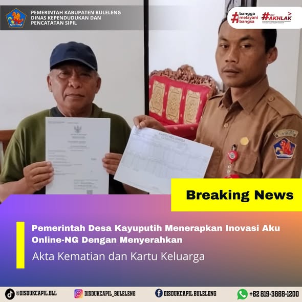 Pemerintah Kabupaten Buleleng melalui Dinas Kependudukan dan Pecatatan Sipil (Disdukcapil) Kabupaten Buleleng memaksimalkan serta mempermudah pelayanan kependudukan masyarakat dengan beberapa inovasi, melalui aplikasi AKU Online-NG. Dimana dalam penerapan aplikasi Aku Online-NG tersebut masyarakat tidak perlu lagi datang ke Dinas Dukcapil untuk melakukan pelayanan langsung cukup dengan datang ke Desa nanti akan dibantu oleh operator Desa masing-masing. Di Desa Kayuputih Kecamatan Banjar, telah diserahkan dokumen kependudukan berupa Akta Kematian atas nama Nyoman Sumeden dan Kartu Keluarga warga Banjar Dinas Desa, Desa Kayuputih Kecamatan Banjar yang diserahkan secara langsung oleh Pemerintahan Desa Kayuputih Kecamatan Banjar, Senin (8/12).