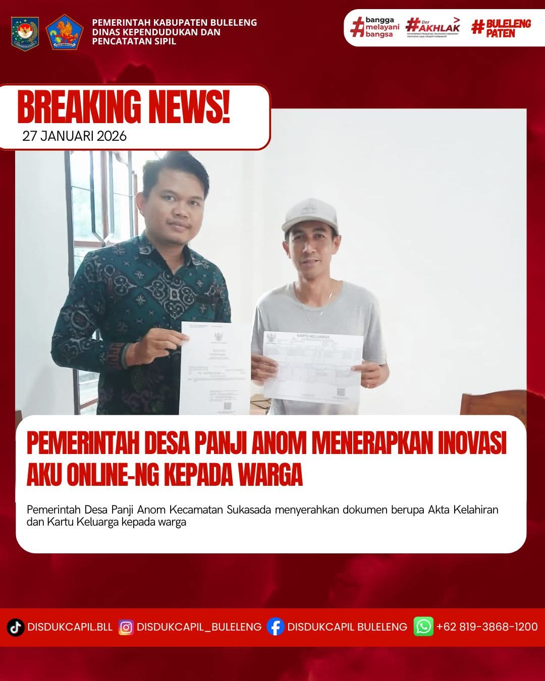 Pemerintah Kabupaten Buleleng melalui Dinas Kependudukan dan Pecatatan Sipil (Disdukcapil) Kabupaten Buleleng memaksimalkan serta mempermudah pelayanan kependudukan masyarakat dengan beberapa inovasi, melalui aplikasi AKU Online-NG. Dimana dalam penerapan aplikasi Aku Online-NG tersebut masyarakat tidak perlu lagi datang ke Dinas Dukcapil untuk melakukan pelayanan langsung cukup dengan datang ke Desa nanti akan dibantu oleh operator Desa masing-masing. Di Desa Panji Anom Kecamatan Sukasada, telah diserahkan dokumen kependudukan berupa Akta Kelahiran atas nama Agung Ryuka Mahendra dan Kartu Keluarga atas nama I Putu Raka Mahendra yang diserahkan langsung oleh Kasi Pemerintahan Desa Panji Anom bertempat di Kantor Perbekel Panji Anom, Kecamatan Sukasada, Selasa (27/1).