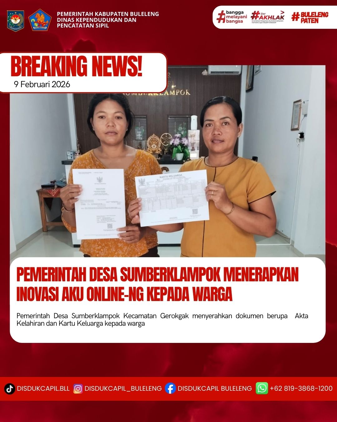 Pemerintah Kabupaten Buleleng melalui Dinas Kependudukan dan Pecatatan Sipil (Disdukcapil) Kabupaten Buleleng memaksimalkan serta mempermudah pelayanan kependudukan masyarakat dengan beberapa inovasi, melalui aplikasi AKU Online-NG. Dimana dalam penerapan aplikasi Aku Online-NG tersebut masyarakat tidak perlu lagi datang ke Dinas Dukcapil untuk melakukan pelayanan langsung cukup dengan datang ke Desa nanti akan dibantu oleh operator Desa masing-masing. Di Desa Sumberklampok Kecamatan Gerokgak, telah diserahkan dokumen kependudukan berupa Akta Kelahrian atas nama Ketut Novi Sariani dan Kartu Keluarga atas nama Kadek Wite Dharma yang diserahkan secara langsung oleh Anggota BPD Ibu Gusti Ayu Putu Eka Arya Wiratmini bertempat di Kantor Perbekel Desa Sumberklampok, Kecamatan Gerokgak, Senin (9/2).